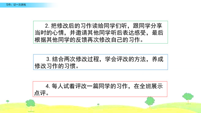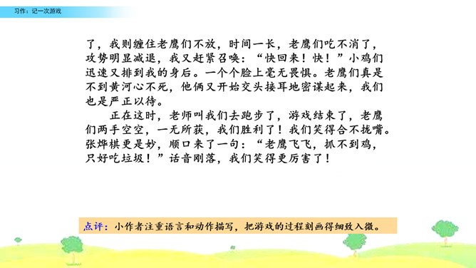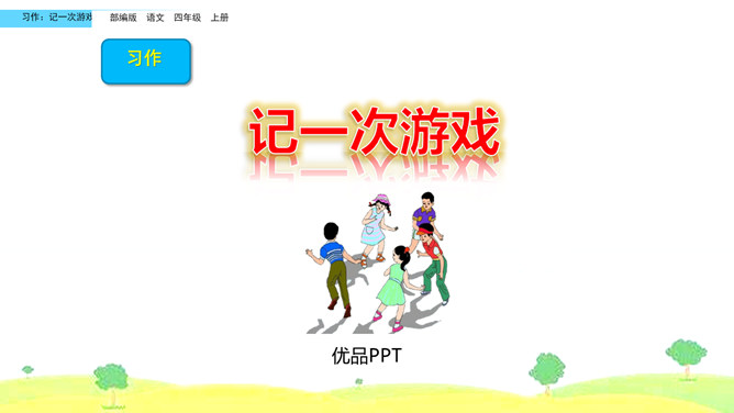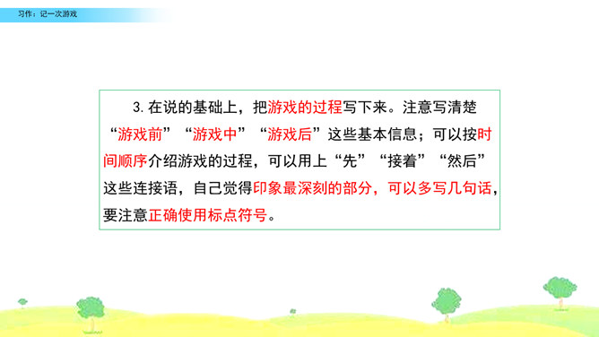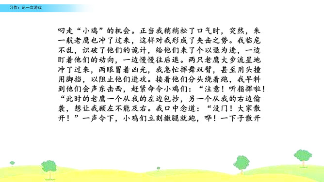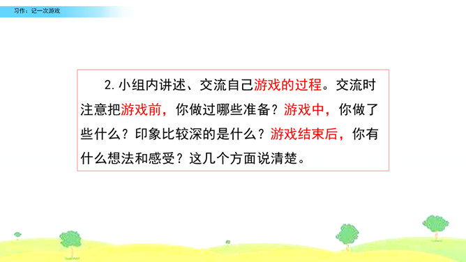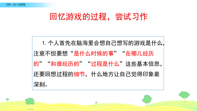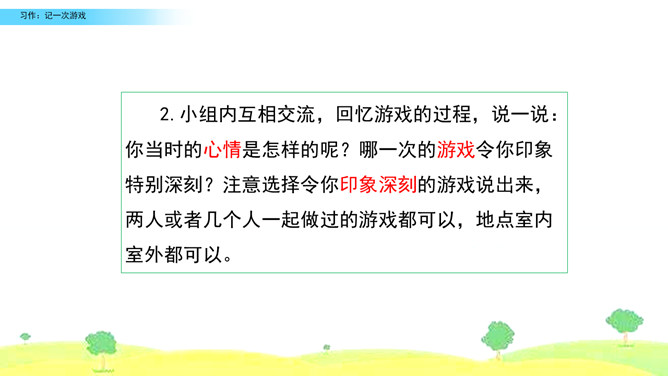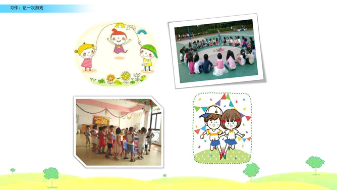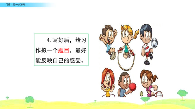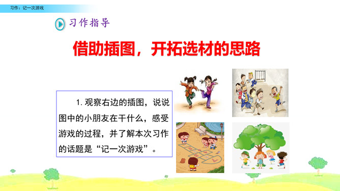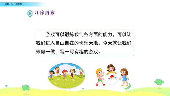 游戏可以锻炼我们各方面的能力,可以让我们进入自由自在的快乐天地。今天就让我们来做一做,写一写有趣的游戏。1.观察右边的插图,说说图中的小朋友在干什么,感受游戏的过程,并了解本次习作的话题是“记一次游戏”。2.小组内互相交流,回忆游戏的过程,说一说:你当时的心情是怎样的呢?哪一次的游戏令你印象特别深刻?注意选择令你印象深刻的游戏说出来,两人或者几个人一起做过的游戏都可以,地点室内室外都可以。所属专题:记一次游戏ppt。