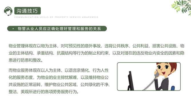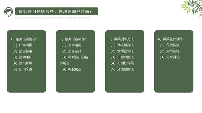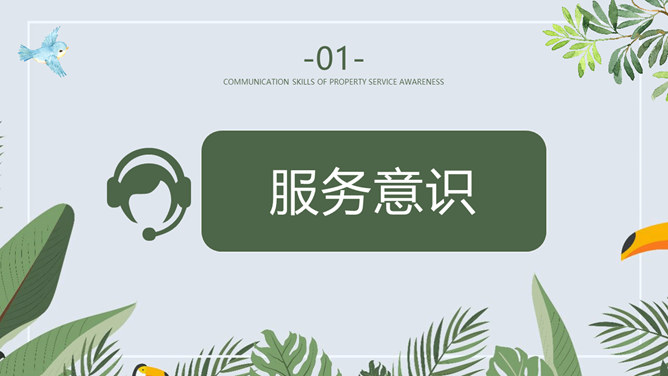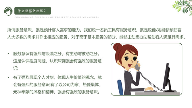 服务意识沟通技巧培训PPT模板。所谓服务意识,就是预计客人需求的能力。我们说一名员工具有服务意识,就是说他/她能够预估客人大多数的需求并作出相应的服务,对于高于基本服务的部分,能够主动想办法帮助客人满足其需求。