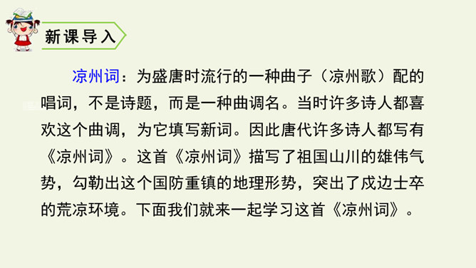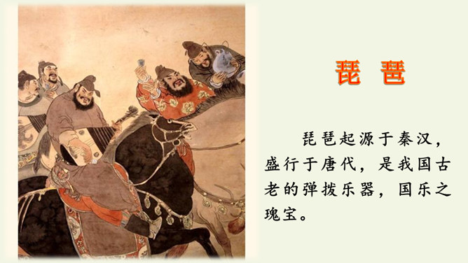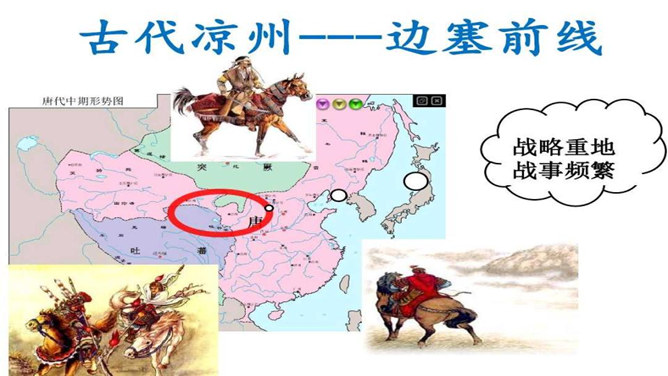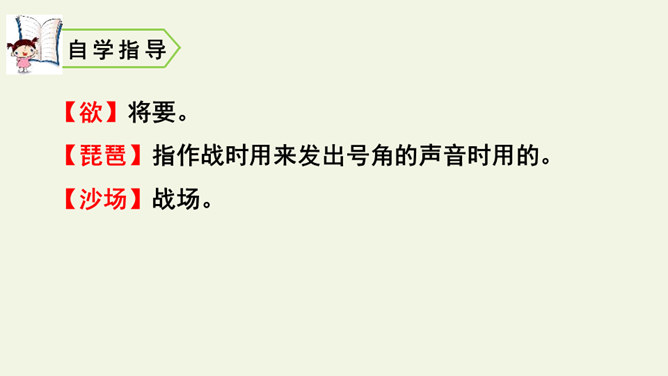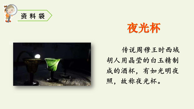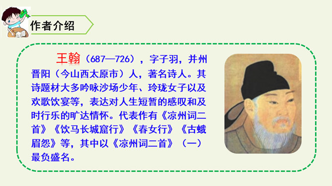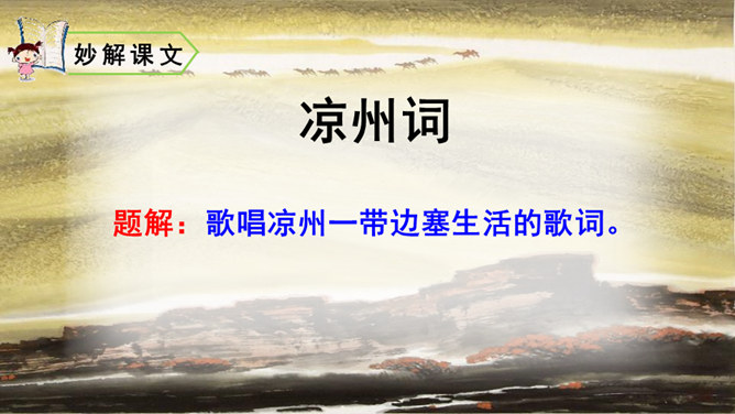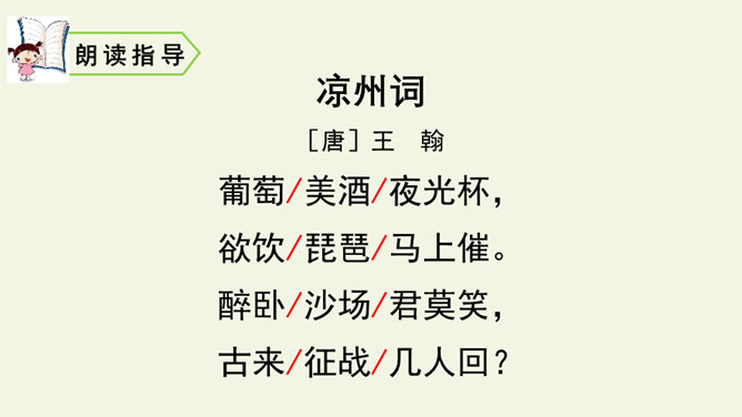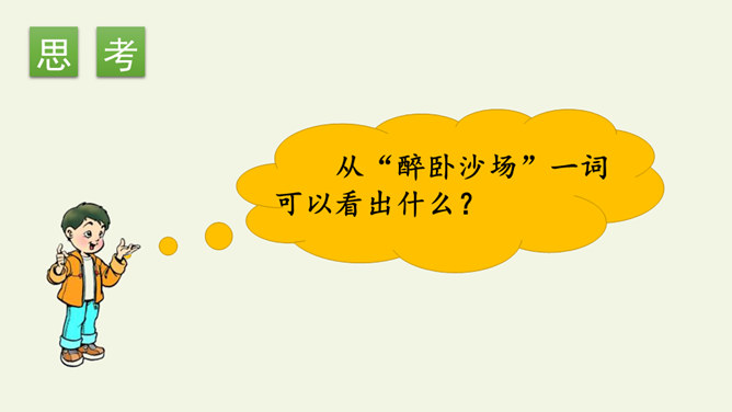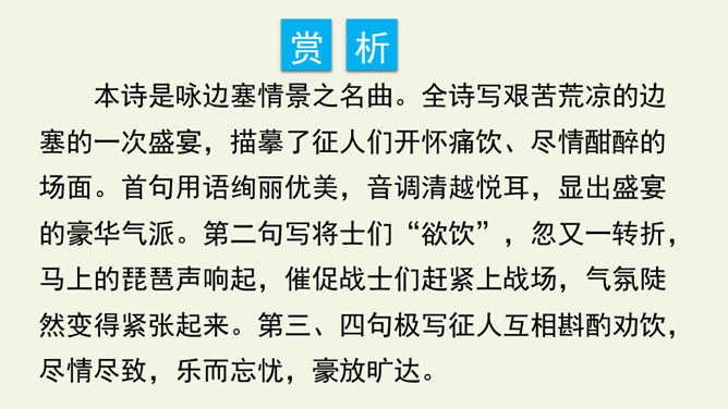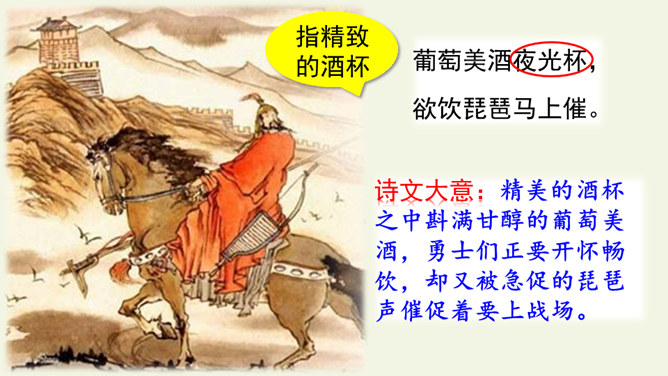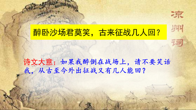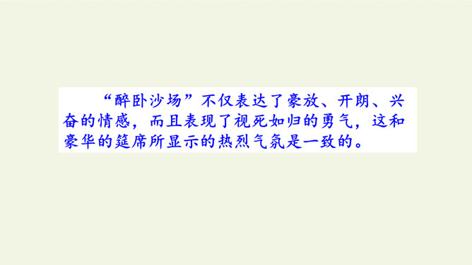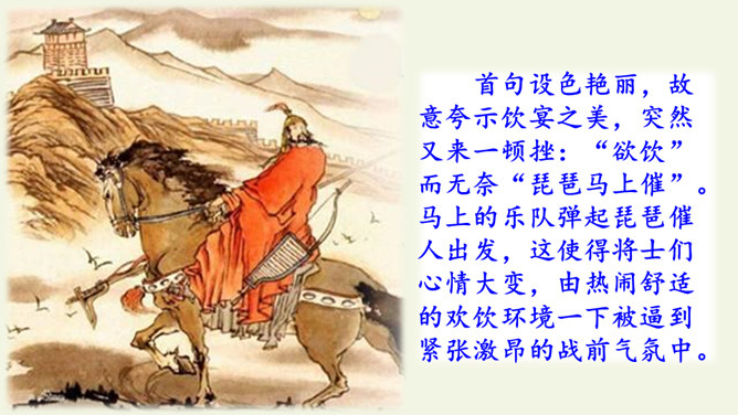 首句设色艳丽,故意夸示饮宴之美,突然又来一顿挫:“欲饮”而无奈“琵琶马上催”。马上的乐队弹起琵琶催人出发,这使得将士们心情大变,由热闹舒适的欢饮环境一下被逼到紧张激昂的战前气氛中。“君莫笑”三字,于顿挫之中一笔挑起,引出了全诗最悲痛、最决绝的一句。“古来征战几人回”运用夸张的手法,写战士们征战沙场,少有人回,表现了战争的激烈、残酷,深化了古诗的主题。“醉卧沙场”不仅表达了豪放、开朗、兴奋的情感,而且表现了视死如归的勇气,这和豪华的筵席所显示的热烈气氛是一致的。所属专题:凉州词ppt。