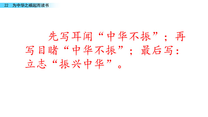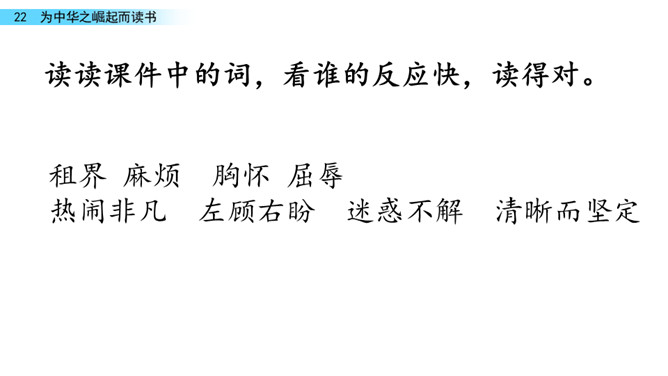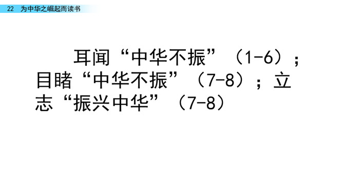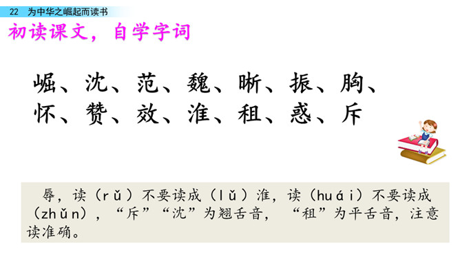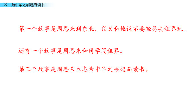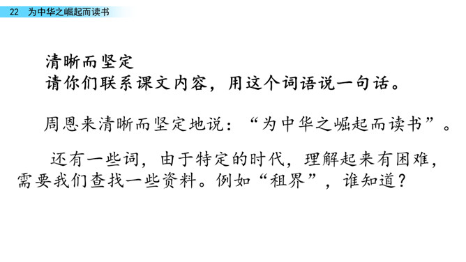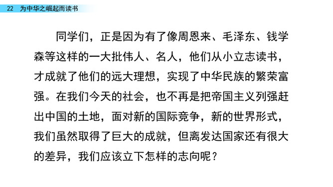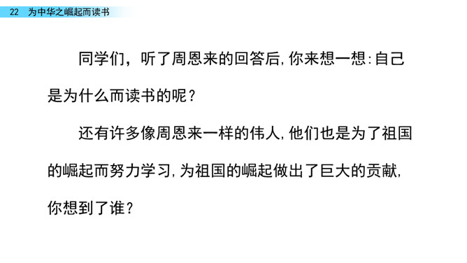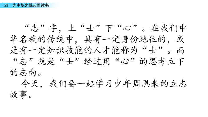 “志”字,上“士”下“心”。在我们中华名族的传统中,具有一定身份地位的,或是有一定知识技能的人才能称为“士”。而“志”就是“士”经过用“心”的思考立下的志向。今天,我们要一起学习少年周恩来的立志故事。 同学们,听了周恩来的回答后,你来想一想:自己是为什么而读书的呢?还有许多像周恩来一样的伟人,他们也是为了祖国的崛起而努力学习,为祖国的崛起做出了巨大的贡献,你想到了谁?所属专题:为中华之崛起而读书ppt。