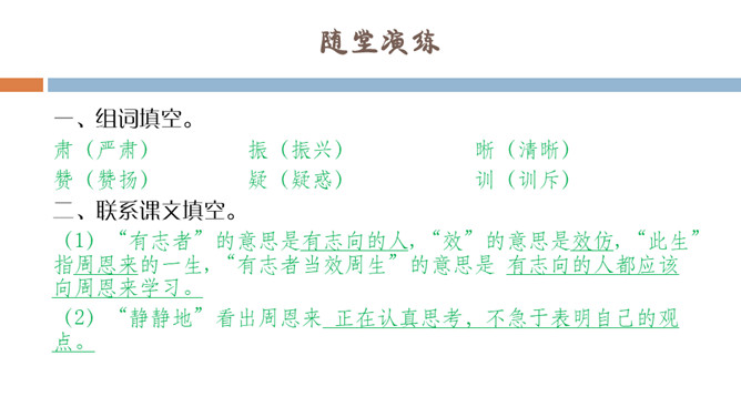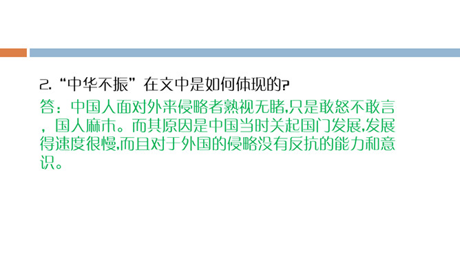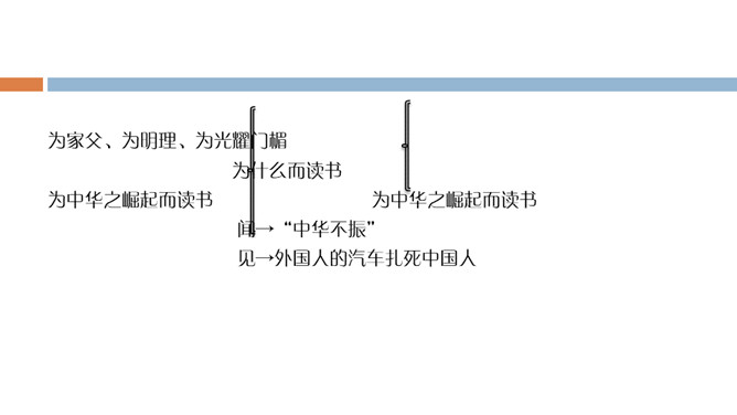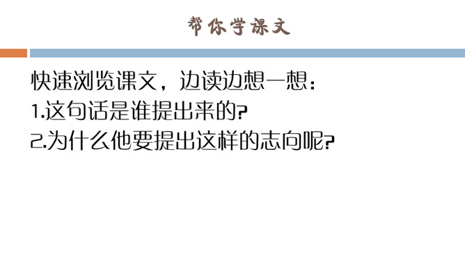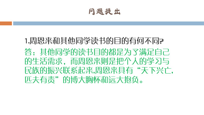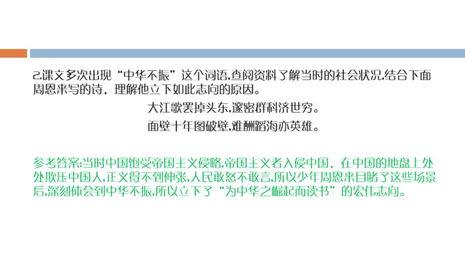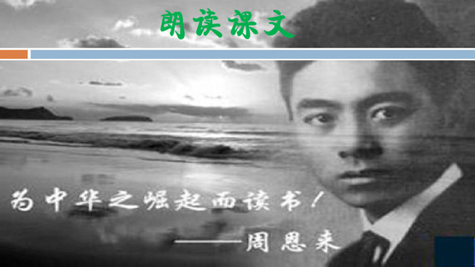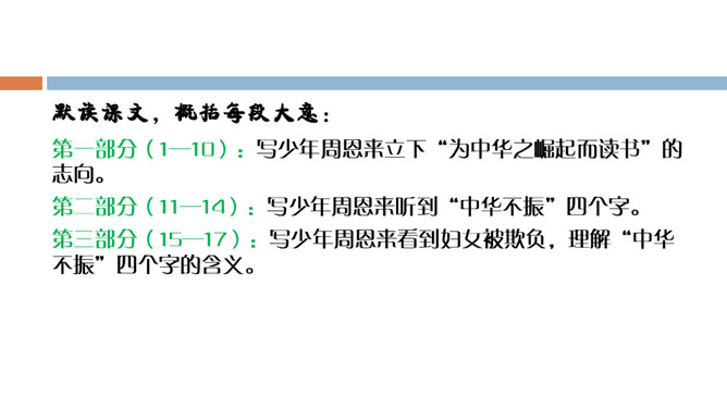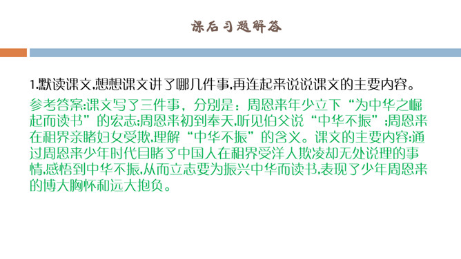 默读课文,想想课文讲了哪几件事,再连起来说说课文的主要内容。参考答案:课文写了三件事,分别是:周恩来年少立下“为中华之崛起而读书”的宏志;周恩来初到奉天,听见伯父说“中华不振”;周恩来在租界亲睹妇女受欺,理解“中华不振”的含义。课文的主要内容:通过周恩来少年时代目睹了中国人在租界受洋人欺凌却无处说理的事情,感悟到中华不振,从而立志要为振兴中华而读书,表现了少年周恩来的博大胸怀和远大抱负。所属专题:为中华之崛起而读书ppt。
