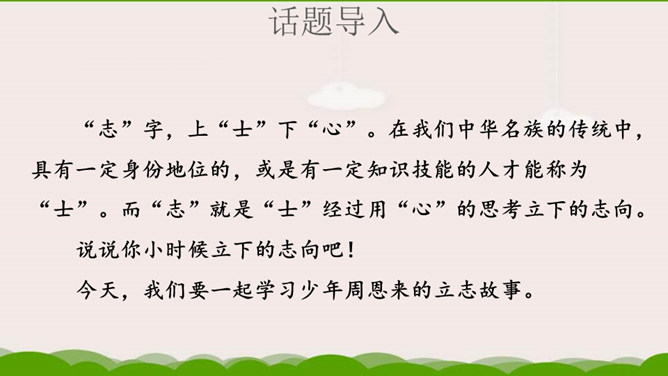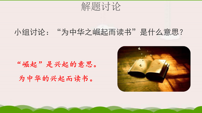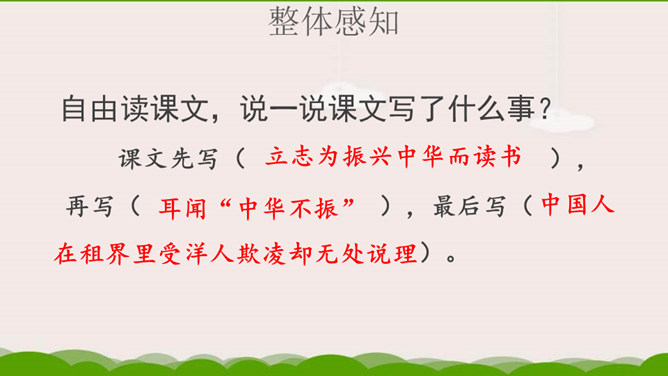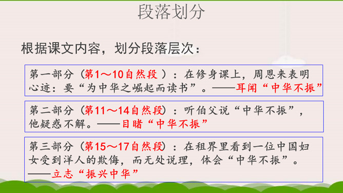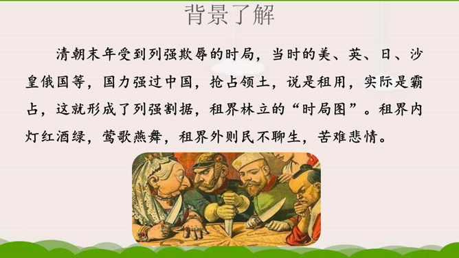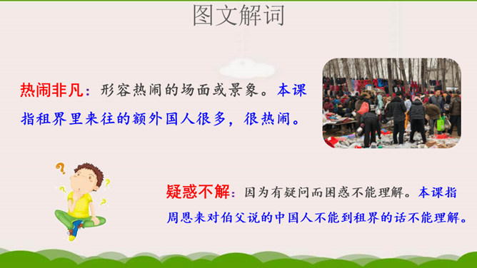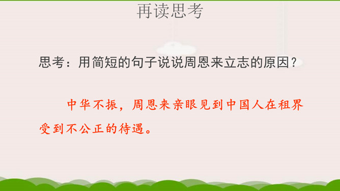 思考:用简短的句子说说周恩来立志的原因?中华不振,周恩来亲眼见到中国人在租界受到不公正的待遇。清朝末年受到列强欺辱的时局,当时的美、英、日、沙皇俄国等,国力强过中国,抢占领土,说是租用,实际是霸占,这就形成了列强割据,租界林立的“时局图”。租界内灯红酒绿,莺歌燕舞,租界外则民不聊生,苦难悲情。热闹非凡:形容热闹的场面或景象。本课指租界里来往的额外国人很多,很热闹。所属专题:为中华之崛起而读书ppt。