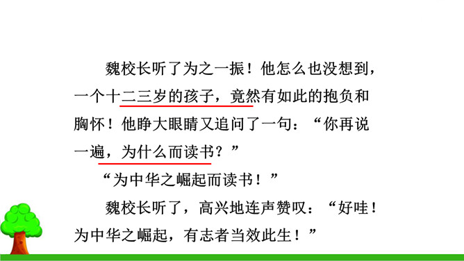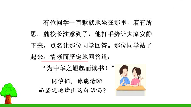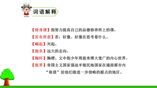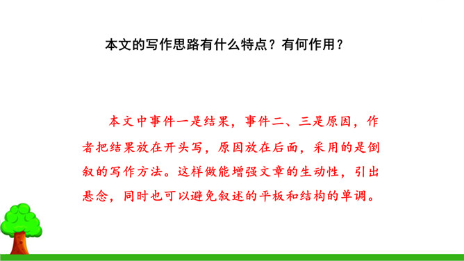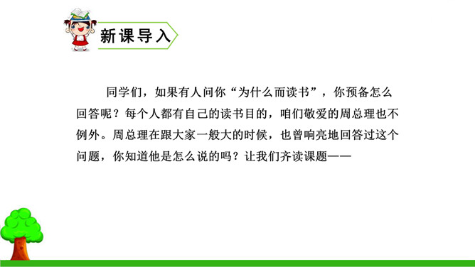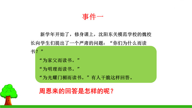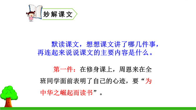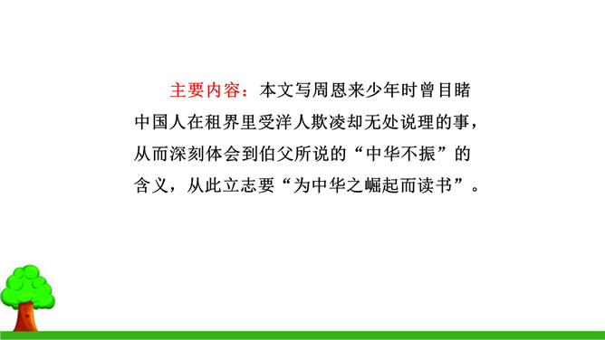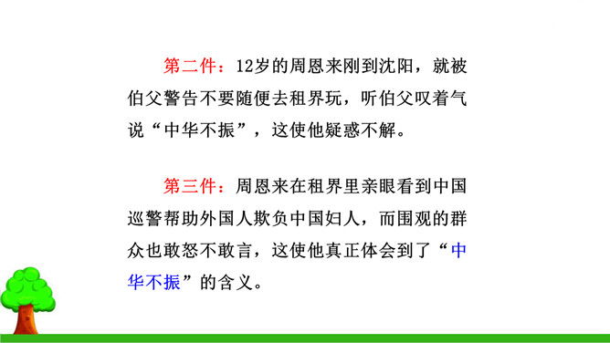 本文的写作思路有什么特点?有何作用?本文中事件一是结果,事件二、三是原因,作者把结果放在开头写,原因放在后面,采用的是倒叙的写作方法。这样做能增强文章的生动性,引出悬念,同时也可以避免叙述的平板和结构的单调。少年周恩来刚到沈阳,就听伯父叹着气说“中华不振”,这使他充满疑惑,想弄个明白。在外国租界他又亲眼目睹一位妇女受洋人欺负,中国巡警不为民申冤,反而训斥那位妇女,围观的中国人敢怒不敢言,这使周恩来深刻体会到中华的确不振。他便一直思考怎样救民于水火,从此明确读书的目的就是要振兴中华。所属专题:为中华之崛起而读书ppt。