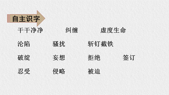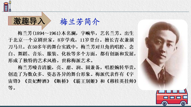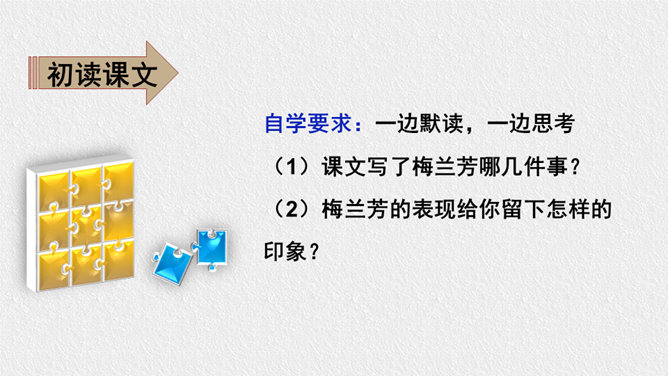 1.学会本课的14个生字,理解用生字组成的词语。(重点)2.正确、流利、有感情地朗读课文。(重点)自学要求:一边默读,一边思考(1)课文写了梅兰芳哪几件事?(2)梅兰芳的表现给你留下怎样的印象?梅兰芳(1894~1961)本名澜,字畹华,艺名兰芳。出生于北京一个京剧世家,8岁学戏,11岁登台。擅长青衣兼演刀马旦。在50多年的舞台实践中,梅兰芳对旦角的唱腔、念白、舞蹈、音乐、服装、化妆等多个方面,都有创新和发展。所属专题:梅兰芳蓄须ppt。