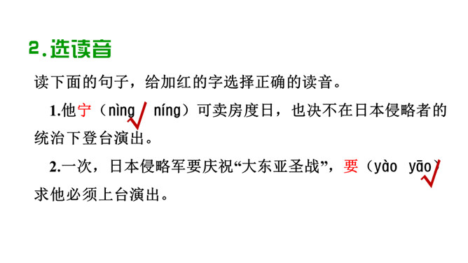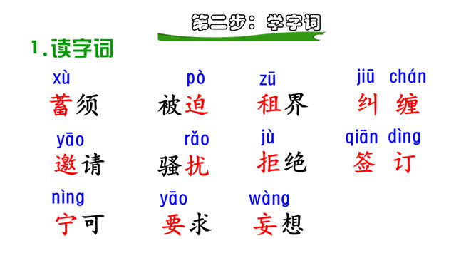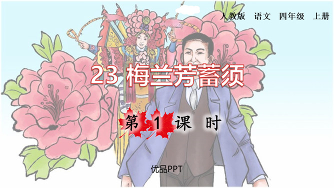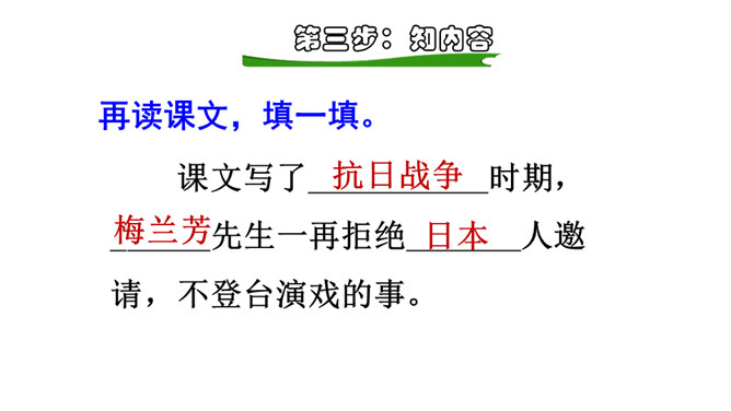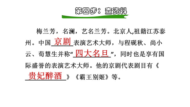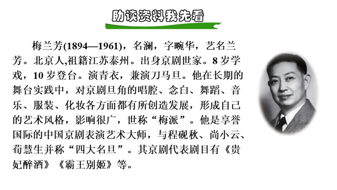 读了上面的资料,你对国粹戏曲大师梅兰芳已经有了初步的了解,让我们走进进梅兰芳,去看看他的故事。现在,让我们开启今天的预习之旅!1.自由朗读课文,圈出生字词,不会读的字查字典解决,难读的地方多读几遍,没把握的地方作批注。2.听范读,注意自己标注的地方,看自己哪些地方读的不准确。3.再读一遍,把课文读通读顺,然后读给爸爸妈妈听。通过预习,你还有哪些不明白的地方,可以在书上做上记号,上课时要想办法解决。所属专题:梅兰芳蓄须ppt。