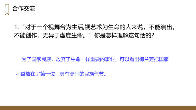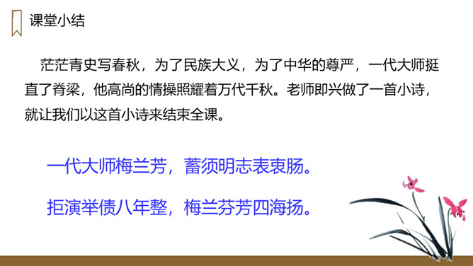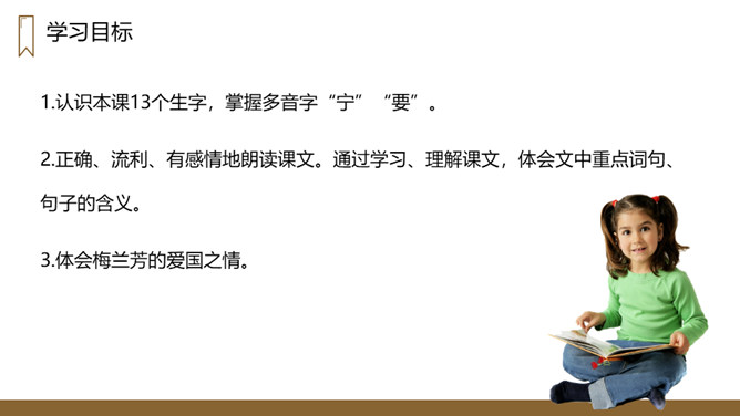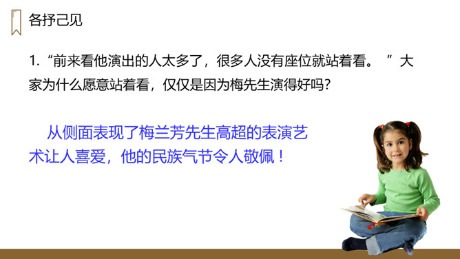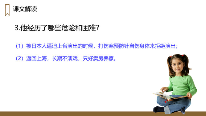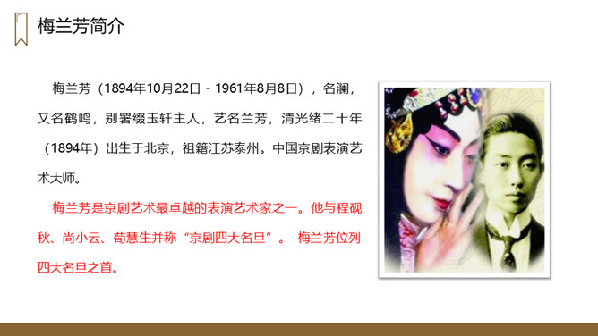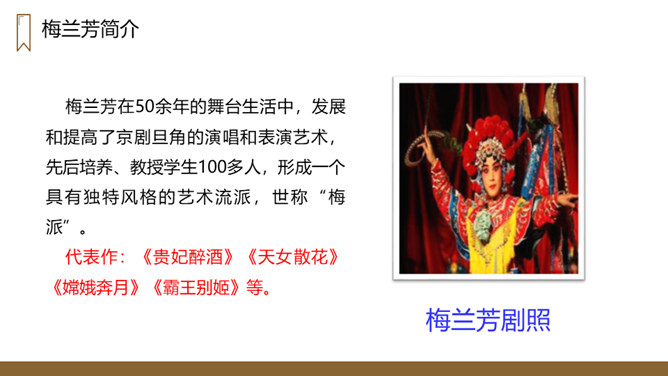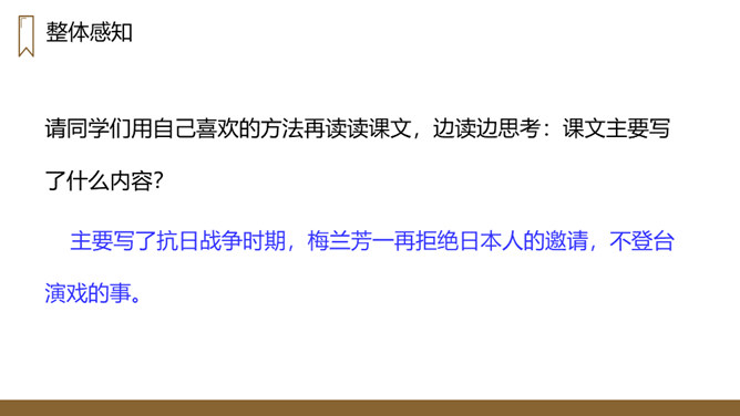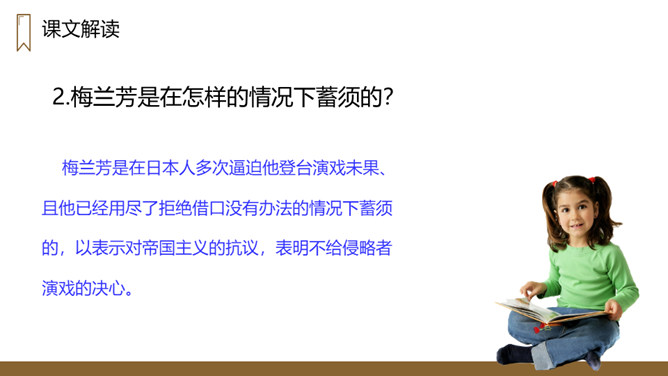 同学们好!今天老师给你们带来了一段戏曲,(出示音频)大家先来听一听,然后告诉老师,你听出这是什么吗?嗯,对了,京剧,京剧是我国的国粹。请同学们用自己喜欢的方法再读读课文,边读边思考:课文主要写了什么内容?主要写了抗日战争时期,梅兰芳一再拒绝日本人的邀请,不登台演戏的事。开火车读课文,想象课文写了梅兰芳哪几件事?并试着用几个词语概括出来。梅兰芳是在怎样的情况下蓄须的?所属专题:梅兰芳蓄须ppt。