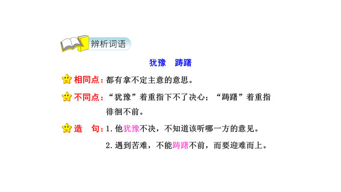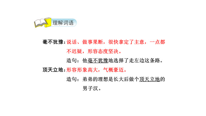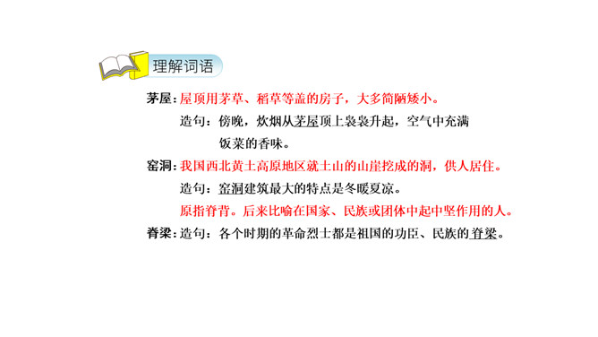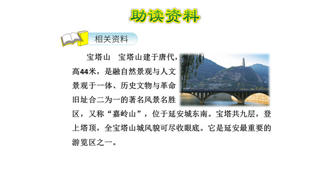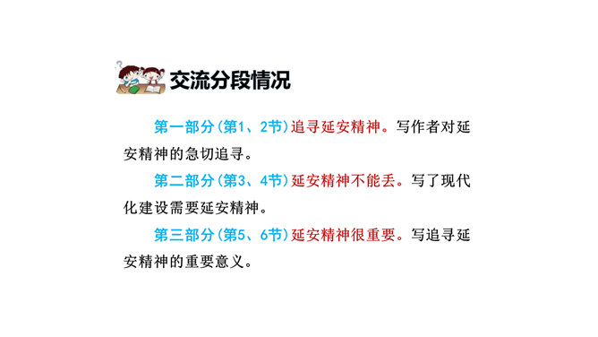 1.认识4个生字,会写4个生字;理解“翩翩、茅屋、窑洞、明媚”等词语。(重点)2.正确、流利、有感情地朗读课文。第一部分(第1、2节)追寻延安精神。写作者对延安精神的急切追寻。第二部分(第3、4节)延安精神不能丢。写了现代化建设需要延安精神。第三部分(第5、6节)延安精神很重要。写追寻延安精神的重要意义。作者追寻延安,追寻的是延安精神。延安精神是全心全意为人民服务的精神,是为崇高理想献身的精神,是革命队伍中互相关心、互相爱护的精神,是自力更生、艰苦奋斗的精神。艰苦奋斗是我们的传家宝。所属专题:延安我把你追寻ppt。