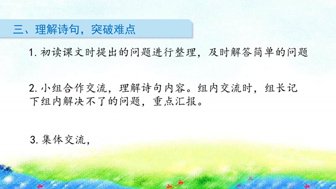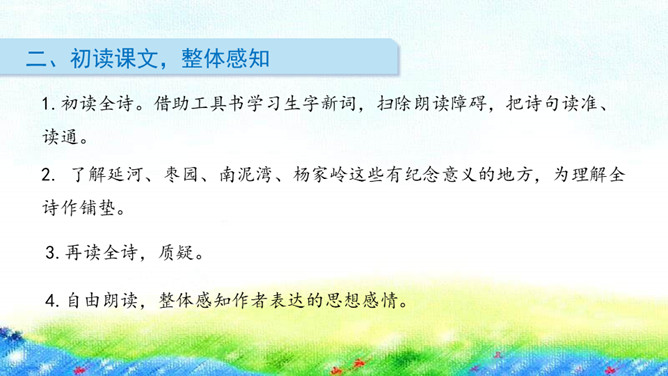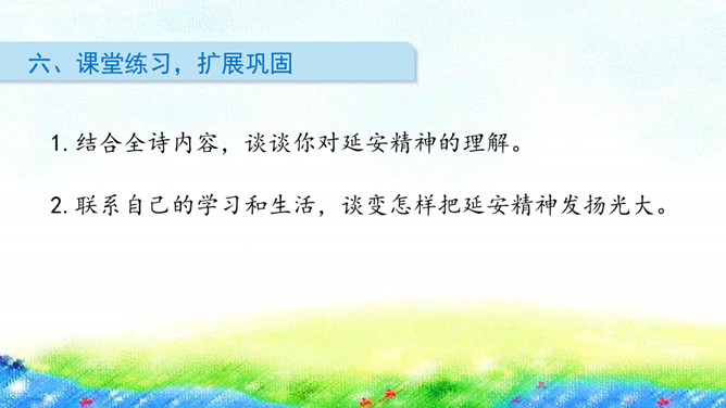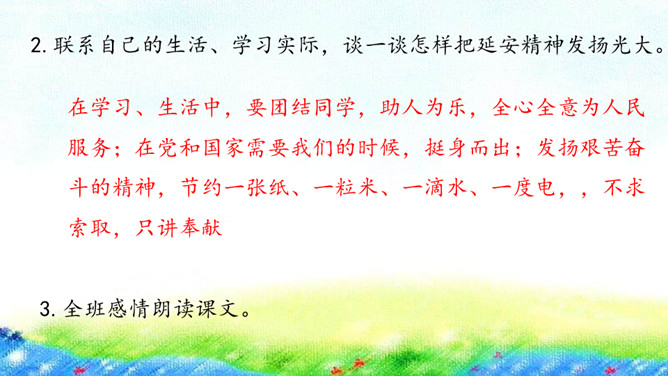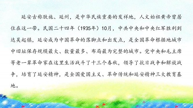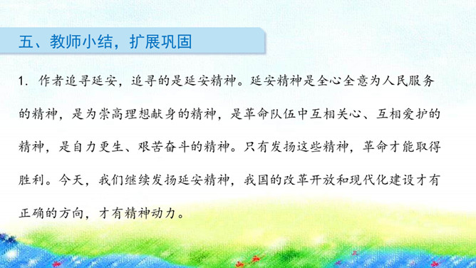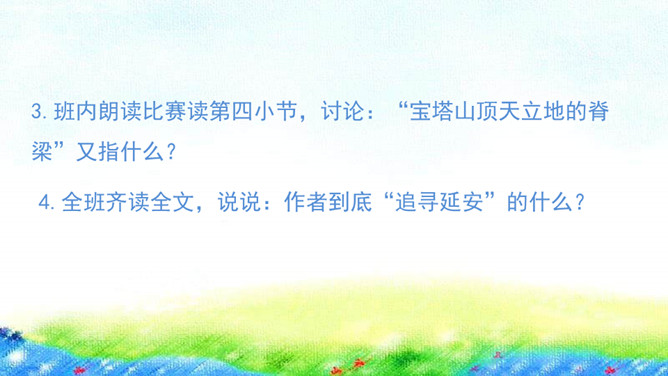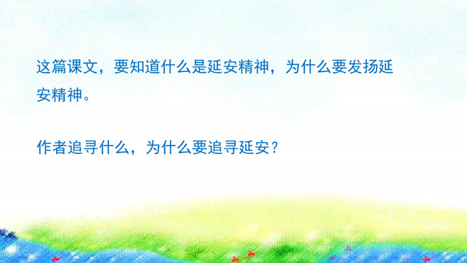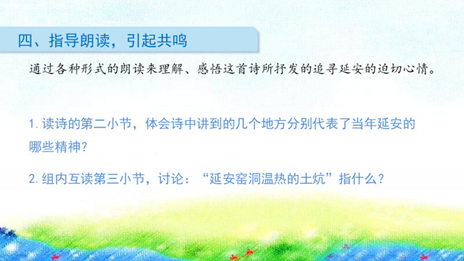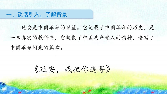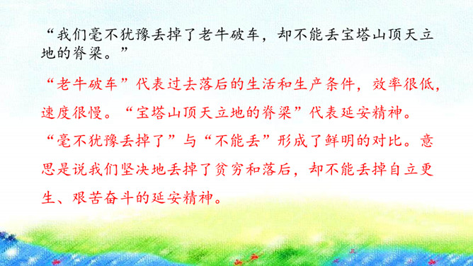 “老牛破车”代表过去落后的生活和生产条件,效率很低,速度很慢。“宝塔山顶天立地的脊梁”代表延安精神。“毫不犹豫丢掉了”与“不能丢”形成了鲜明的对比。意思是说我们坚决地丢掉了贫穷和落后,却不能丢掉自立更生、艰苦奋斗的延安精神。1.读诗的第二小节,体会诗中讲到的几个地方分别代表了当年延安的哪些精神?2.组内互读第三小节,讨论:“延安窑洞温热的土炕”指什么?所属专题:延安我把你追寻ppt。