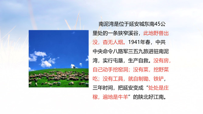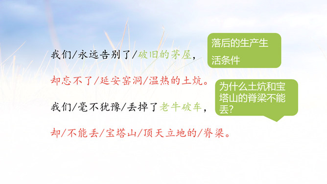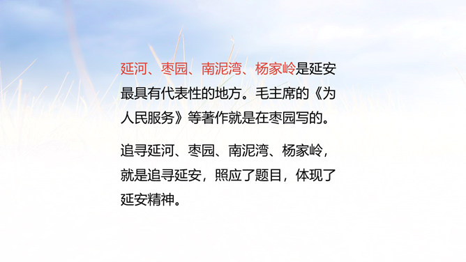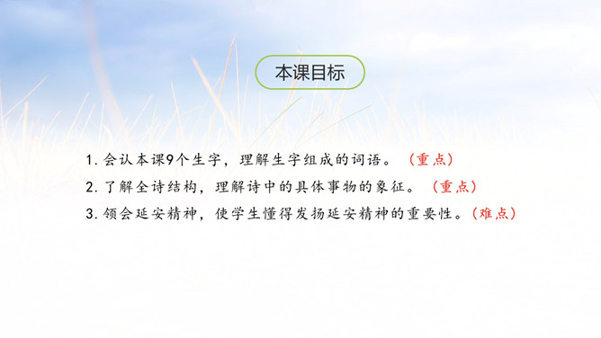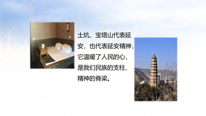延安是中国革命的摇篮,它记载中国革命的历史,是一本真实的教科书。它凝聚了共产党人的精神,谱写了中国革命闪光的篇章。1.会认本课9个生字,理解生字组成的词语。 (重点)2.了解全诗结构,理解诗中的具体事物的象征。 (重点)3.领会延安精神,使学生懂得发扬延安精神的重要性。(难点)延河、枣园、南泥湾、杨家岭是延安最具有代表性的地方。毛主席的《为人民服务》等著作就是在枣园写的。所属专题:延安我把你追寻ppt。