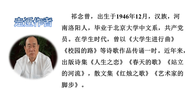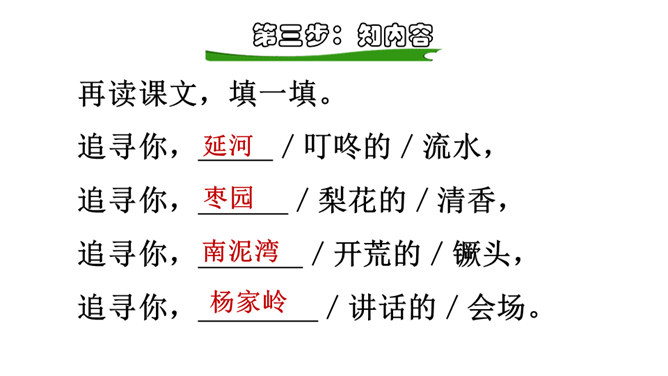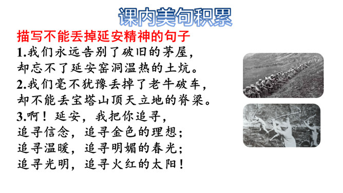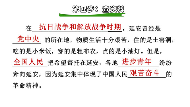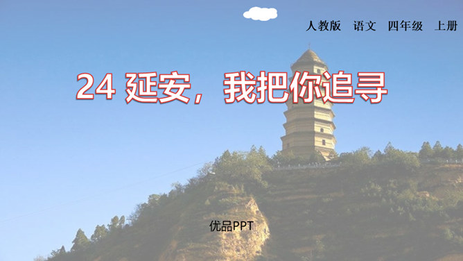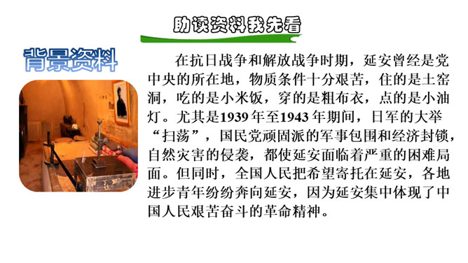 读了上面的资料,你对延安已经有了初步的了解,那么在作者的笔下,延安又是怎样的呢?现在,让我们开启今天的预习之旅!1.自由朗读课文,圈出生字词,不会读的字查字典解决,难读的地方多读几遍,没把握的地方作批注。2.听范读,注意自己标注的地方,看自己哪些地方读的不准确。3.再读一遍,把课文读通读顺,然后读给爸爸妈妈听。通过预习,你还有哪些不明白的地方,可以在书上做上记号,上课时要想办法解决。所属专题:延安我把你追寻ppt。
