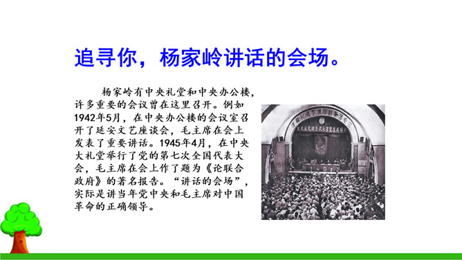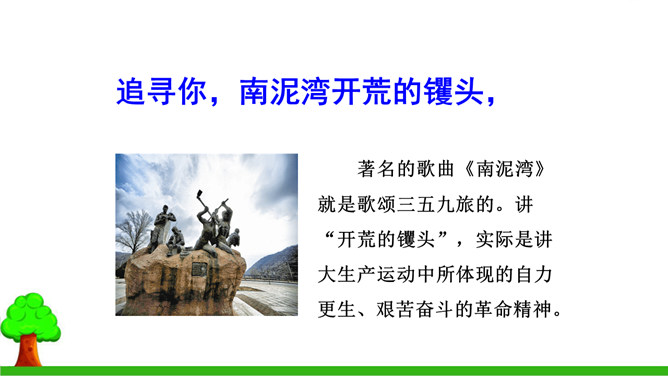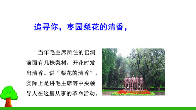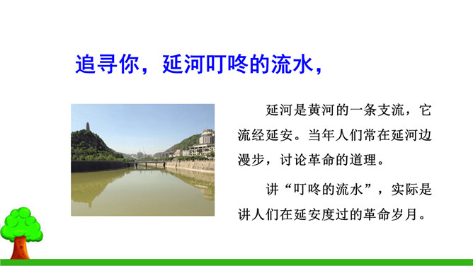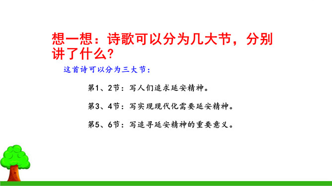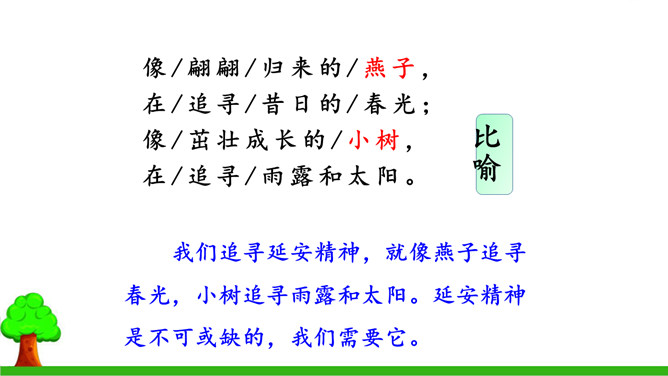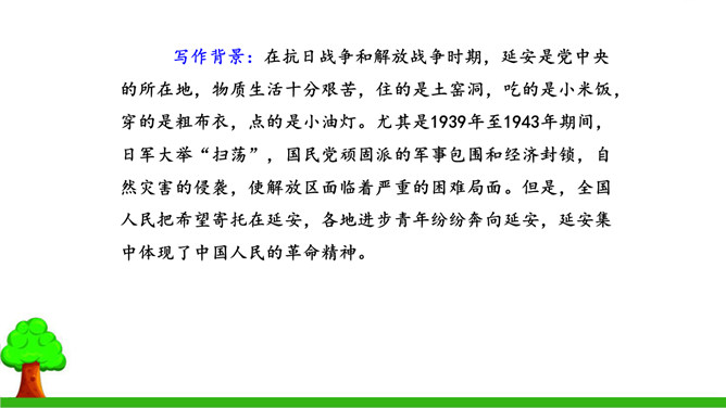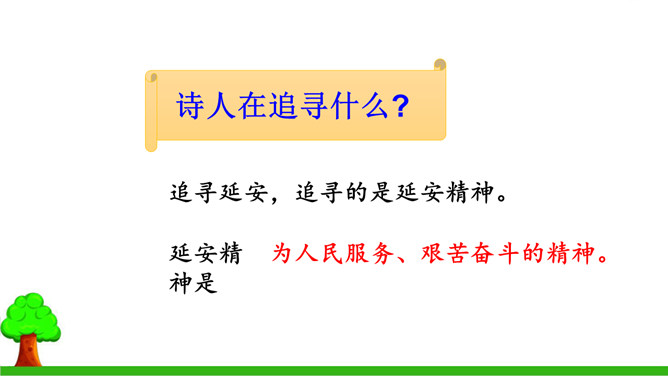 作者追寻延安,追寻的是延安精神。延安精神是全心全意为人民服务的精神,是为崇高理想献身的精神,是革命队伍中互相关心、互相爱护的精神,是自力更生、艰苦奋斗的精神。延安精神是我们的传家宝。即使现在我们的经济发达了,生活富裕了,也还要提倡这种精神。为了把社会推向前进,总要开辟新领域,探索新事物,这就必须发扬延安精神。联系自己的生活实际,谈一谈怎样把延安精神发扬光大。所属专题:延安我把你追寻ppt。