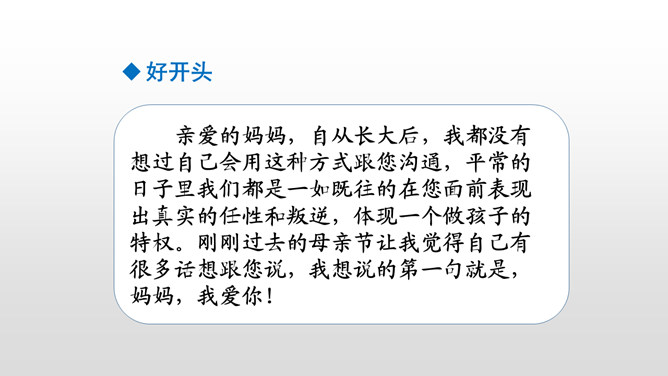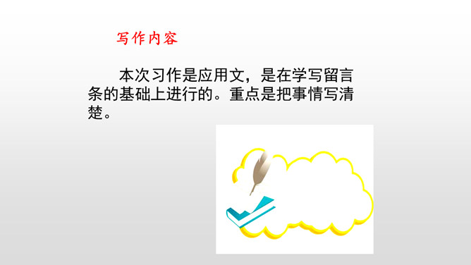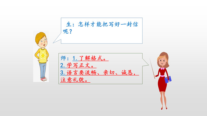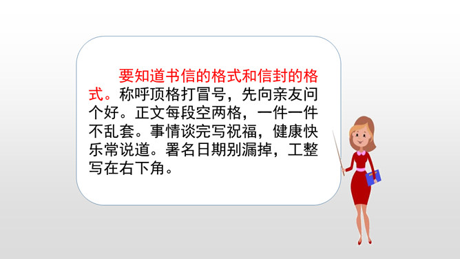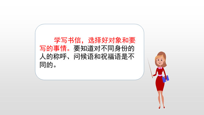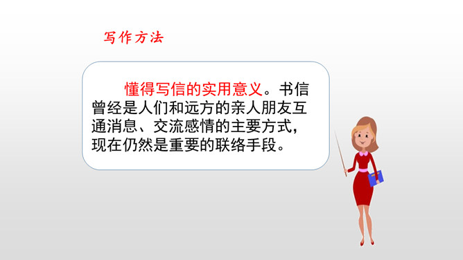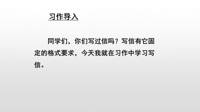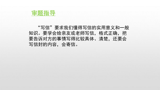 同学们,你们写过信吗?写信有它固定的格式要求,今天我就在习作中学习写信。学习书信的格式,练习把事情写清楚。“写信”要求我们懂得写信的实用意义和一般知识。要学会给亲友或老师写信,格式正确,把要告诉对方的事情写得比较具体、清楚,还要会写信封的内容,会寄信。本次习作是应用文,是在学写留言条的基础上进行的。重点是把事情写清楚。懂得写信的实用意义。书信曾经是人们和远方的亲人朋友互通消息、交流感情的主要方式。所属专题:写信ppt。