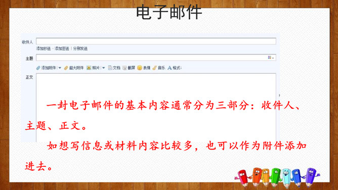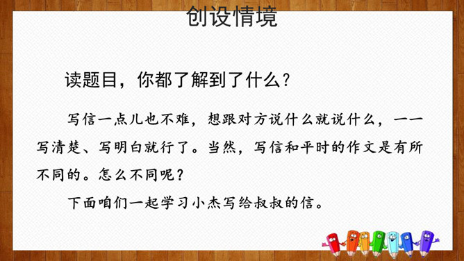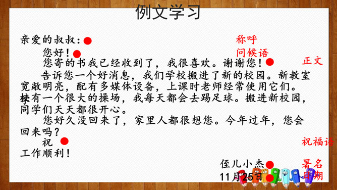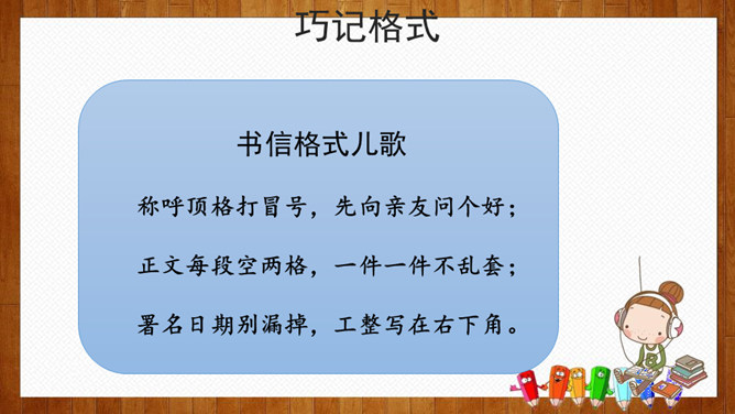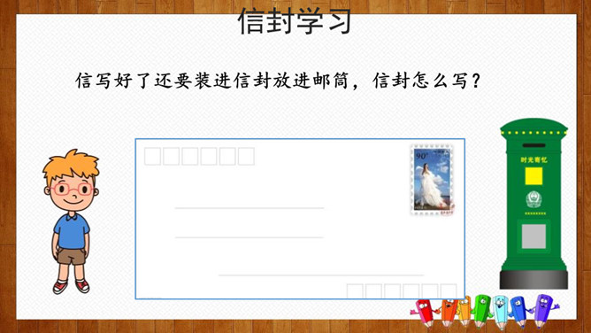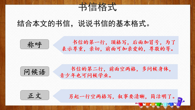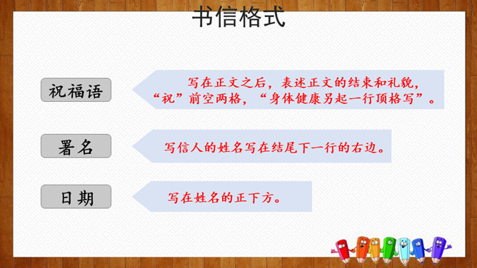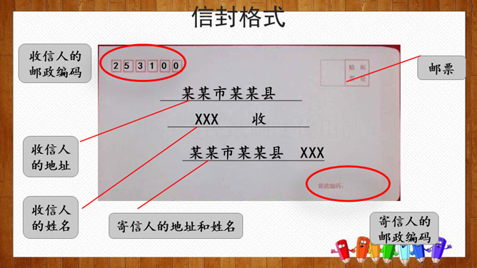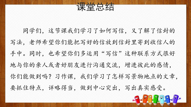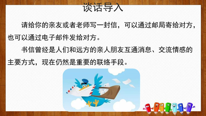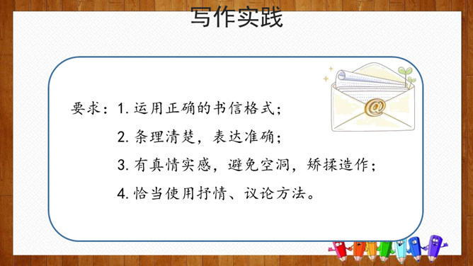 小组内交流,说一说你想给谁写信,所写内容(称呼、问候语、正文、祝福语等),也可把你最想给爸爸妈妈说的话用写信的形式写下来。请给你的亲友或者老师写一封信,可以通过邮局寄给对方,也可以通过电子邮件发给对方。书信曾经是人们和远方的亲人朋友互通消息、交流情感的主要方式,现在仍然是重要的联络手段。要求:1.运用正确的书信格式;2.条理清楚,表达准确;3.有真情实感,避免空洞,矫揉造作。所属专题:写信ppt。