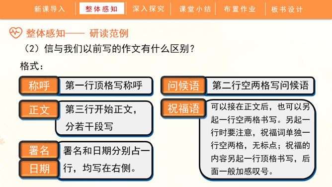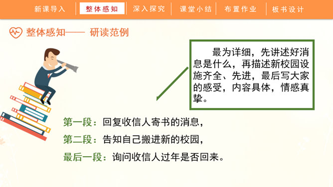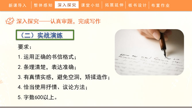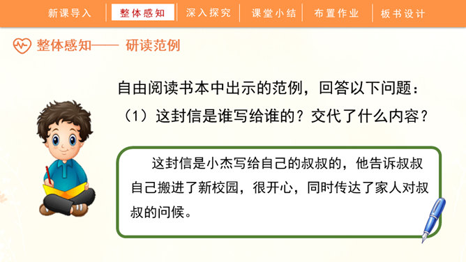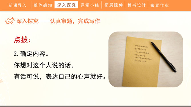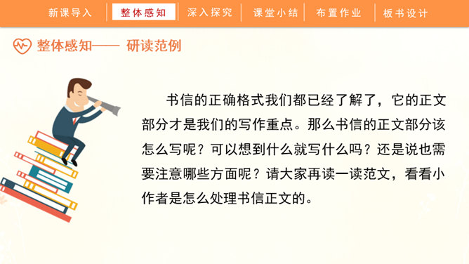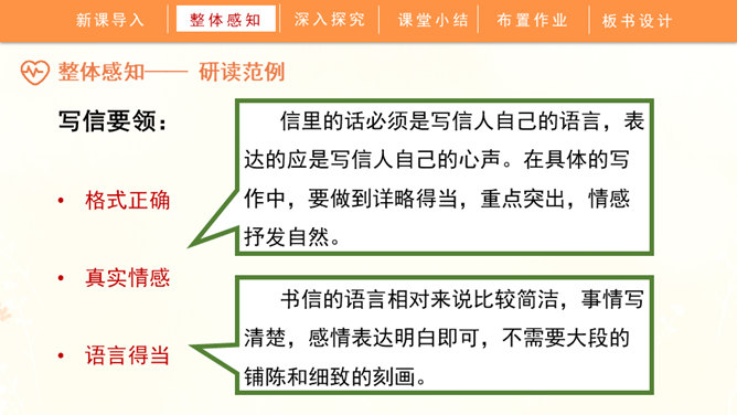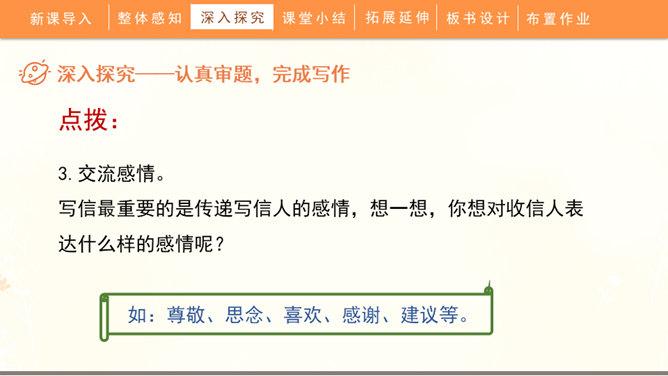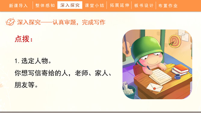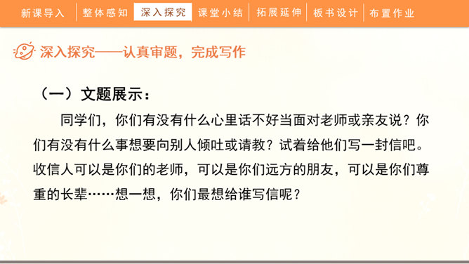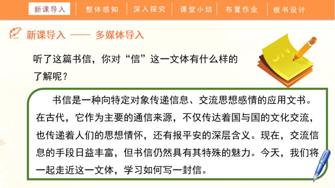 聆听书信,说一说他带给你的感受:这封信是谁写给谁的?信中写了什么内容?这些内容让你生发出什么情绪?书信是一种向特定对象传递信息、交流思想感情的应用文书。在古代,它作为主要的通信来源,不仅传达着国与国的文化交流,也传递着人们的思想情怀,还有报平安的深层含义。现在,交流信息的手段日益丰富,但书信仍然具有其特殊的魅力。今天,我们将一起走近这一文体,学习如何写一封信。所属专题:写信ppt。