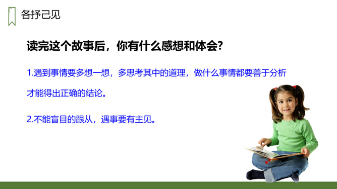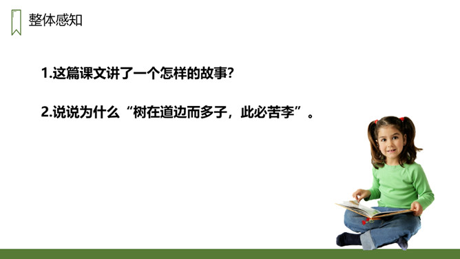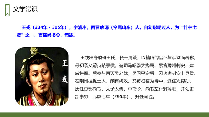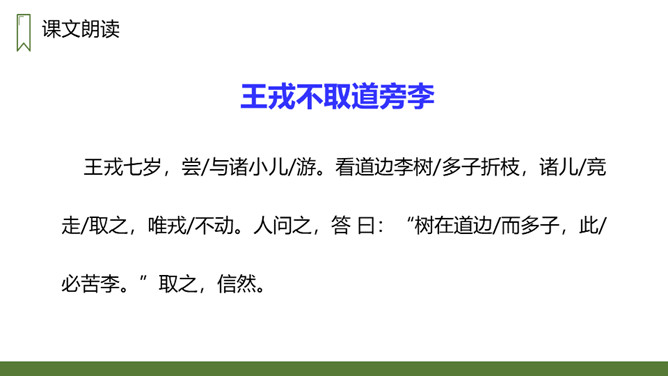 你觉得王戎是个怎样的人?从哪里可以看出来?王戎是个有主见不盲从、聪明的人。从“诸儿竞走取之,唯戎不动”可以看出他不随主流,有自己主见;从“树在道边而多子,此必苦李”可以看出他很聪明。读完这个故事后,你有什么感想和体会?遇到事情要多想一想,多思考其中的道理,做什么事情都要善于分析才能得出正确的结论。不能盲目的跟从,遇事要有主见。联系生活实际及身边发生的事情,王戎使你想到了什么人?所属专题:王戎不取道旁李ppt。