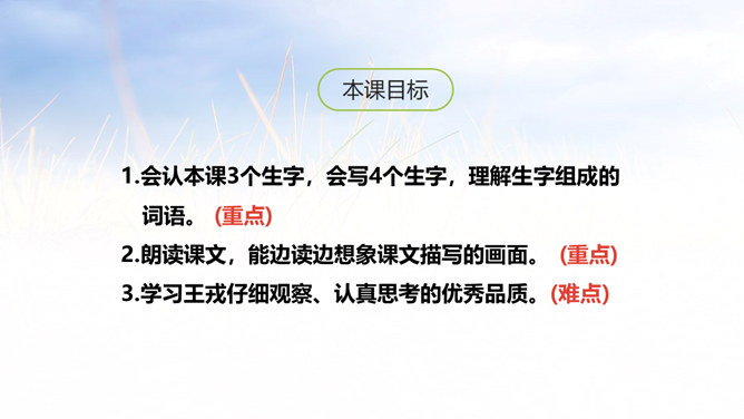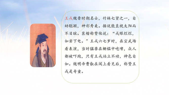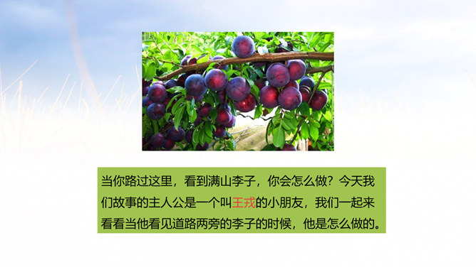 当你路过这里,看到满山李子,你会怎么做?今天我们故事的主人公是一个叫王戎的小朋友,我们一起来看看当他看见道路两旁的李子的时候,他是怎么做的。1.会认本课3个生字,会写4个生字,理解生字组成的词语。 (重点)2.朗读课文,能边读边想象课文描写的画面。 (重点)3.学习王戎仔细观察、认真思考的优秀品质。(难点)自己小声读课文,边读边想:课文主要讲了一件什么事?王戎看见路边李子多而不摘的故事。所属专题:王戎不取道旁李ppt。