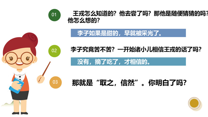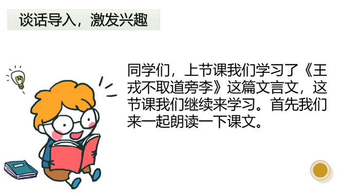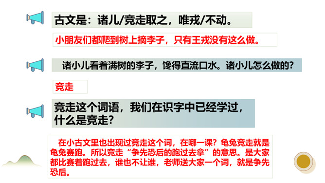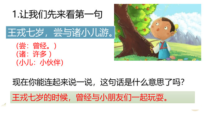 正当小朋友们玩得欢天喜地的时候,他们又看到了什么?他们发现路边长着一棵茂密的李树。在小古文里也出现过竞走这个词,在哪一课?龟兔竞走就是龟兔赛跑。所以竞走“争先恐后的跑过去拿”的意思。是大家都比赛着跑过去,谁也不让谁,老师送大家一个词,就是争先恐后。今天我们学习了这篇课文,我学会了什么是实词和虚词。并且我从聪明过人的王戎身上,我知道了遇到事情要多观察,多思考。所属专题:王戎不取道旁李ppt。