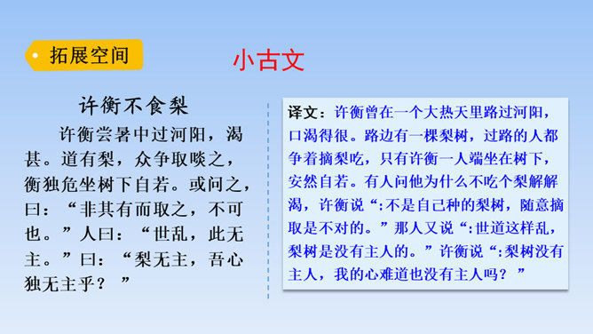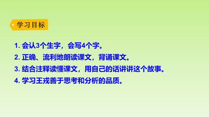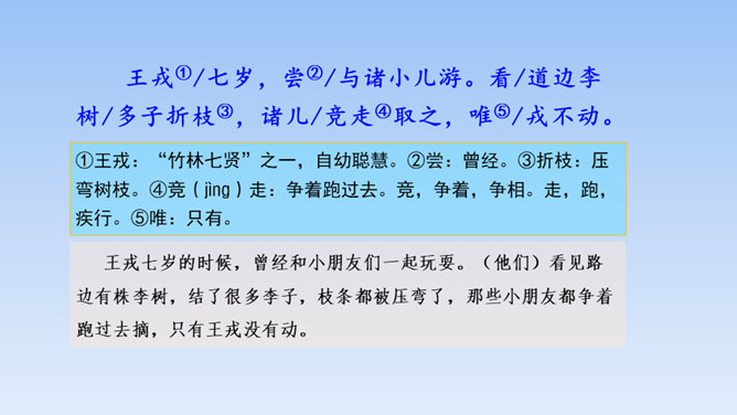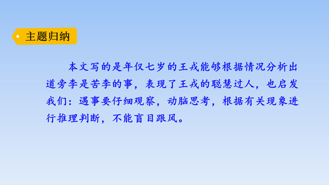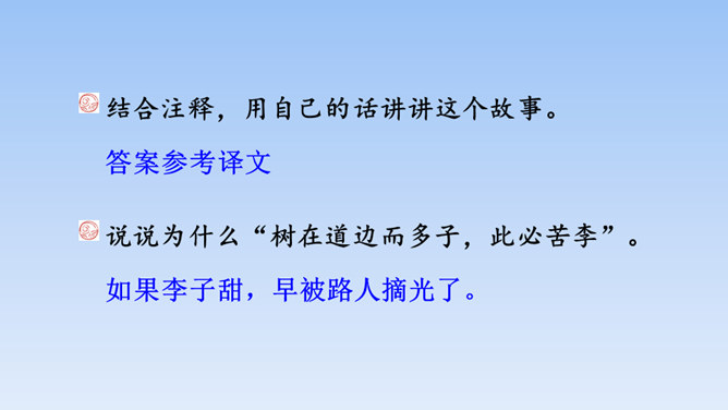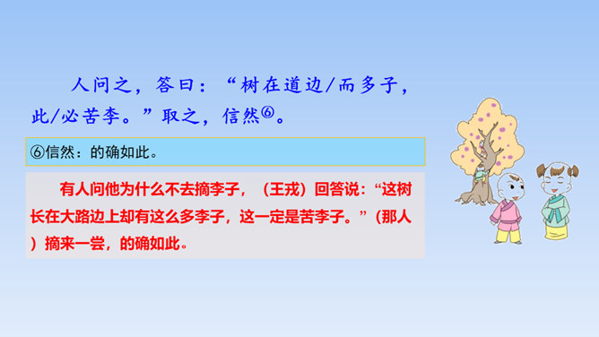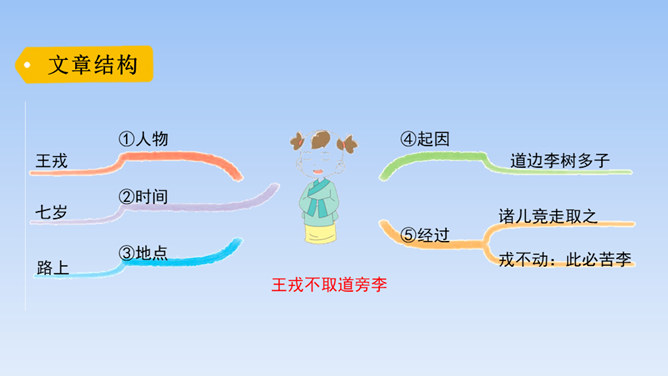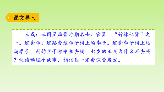 王戎:三国至西晋时期名士、官员,“竹林七贤”之一。道旁李:道路旁边李子树上的李子。道旁李子树上结满李子,别的孩子都争相去摘,七岁的王戎为什么不去呢?快读读这个故事,相信你一定会深受启发。1. 会认3个生字,会写4个字。2. 正确、流利地朗读课文,背诵课文。3. 结合注释读懂课文,用自己的话讲讲这个故事。4. 学习王戎善于思考和分析的品质。1.这篇课文的题目有什么特点?这篇课文的题目提示了文章的主要内容。所属专题:王戎不取道旁李ppt。
