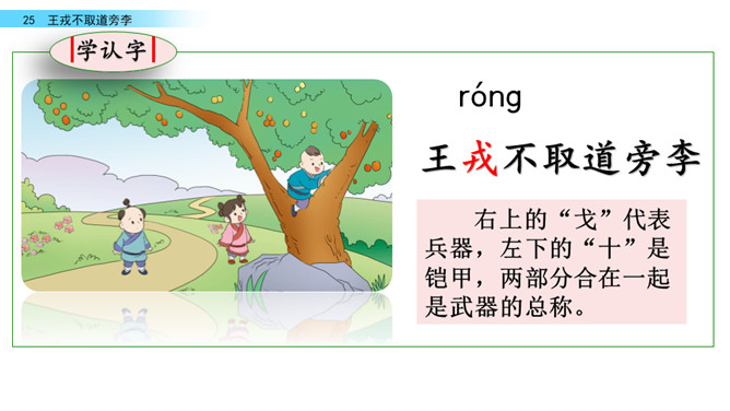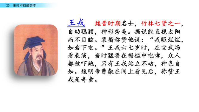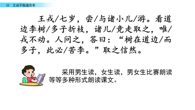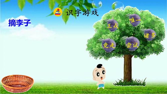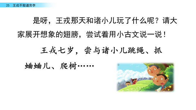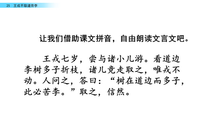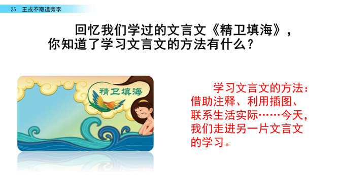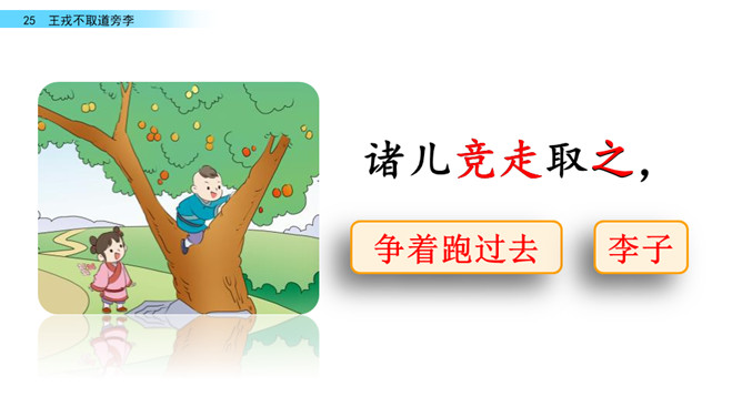 回忆我们学过的文言文《精卫填海》,你知道了学习文言文的方法有什么?学习文言文的方法:借助注释、利用插图、联系生活实际……今天,我们走进另一片文言文的学习。让我们借助课文拼音,自由朗读文言文吧。采用男生读,女生读,男女生比赛朗读等等多种形式朗读课文。诸儿看到满树的李子是怎么做的?找出相关语句吧!诸小儿去摘李子的时候,会说些什么?动作是怎样的?用自己的话讲一讲想到的情景吧。所属专题:王戎不取道旁李ppt。