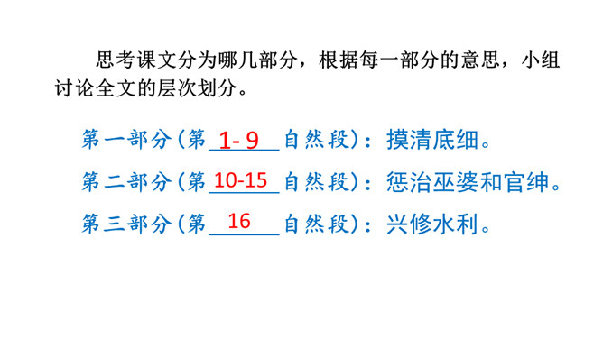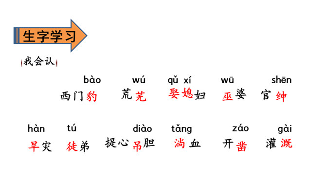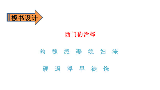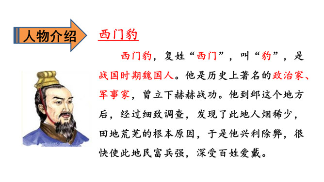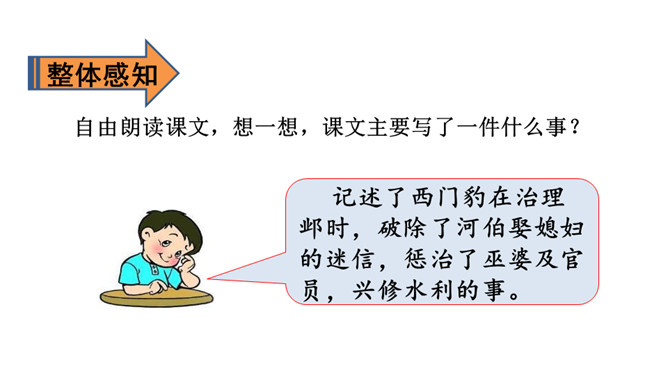 1.会认13个生字,会写12个生字。(重点)2.正确、流利、有感情地朗读课文。3.理清流利、有感情地朗读课文(重点)谁知道这三个字怎样读?知道是什么意思吗?自由朗读课文,想一想,课文主要写了一件什么事?自由朗读课文,想一想,课文主要写了一件什么事?思考课文分为哪几部分,根据每一部分的意思,小组讨论全文的层次划分。第一部分:摸清底细。第二部分:惩治巫婆和官绅。第三部分:兴修水利。所属专题:西门豹治邺ppt。