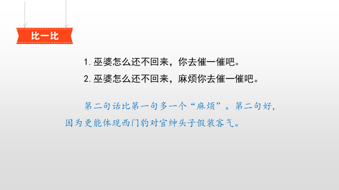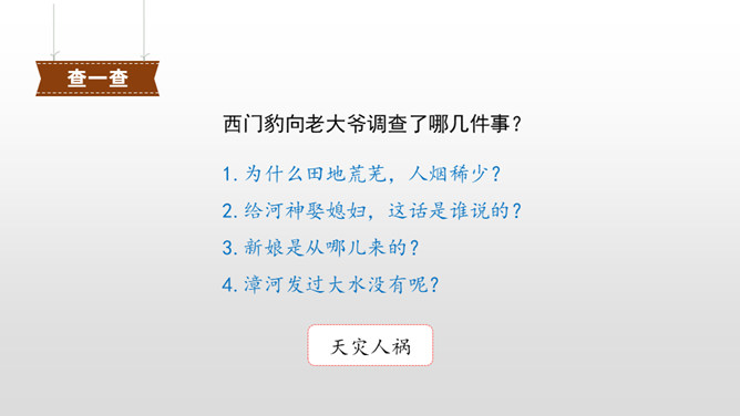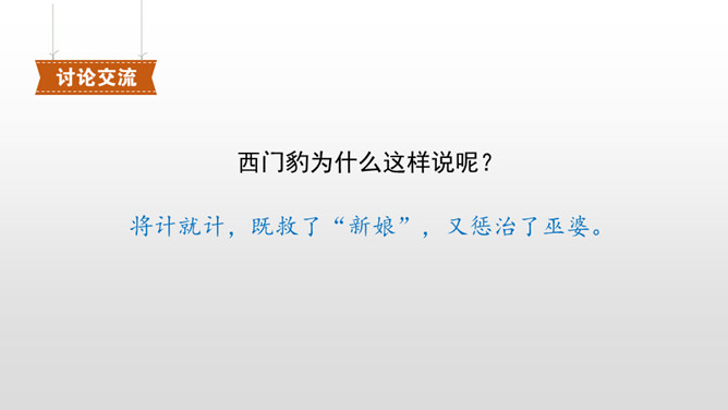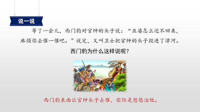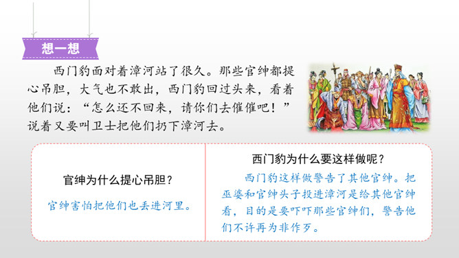 西门豹到了邺县这个地方,映入眼帘的是什么景象?田地荒芜,人烟稀少。西门豹向老大爷调查了哪几件事?1.为什么田地荒芜,人烟稀少?2.给河神娶媳妇,这话是谁说的?3.新娘是从哪儿来的?4.漳河发过大水没有呢?自己喜欢的方式阅读课文第10~14自然段,画出描写西门豹言行的句子,体会他为什么要这么说、这么做。同伴一起讨论讨论。设想一下,岸上的老百姓看了事情的经过会有什么反应?会说些什么?先说一说,然后写下来。所属专题:西门豹治邺ppt。