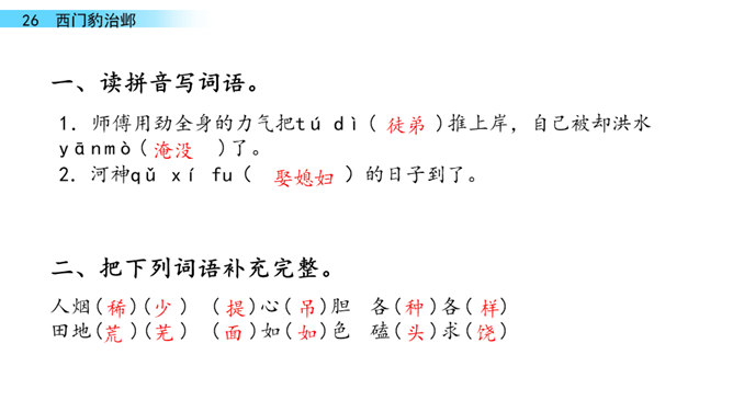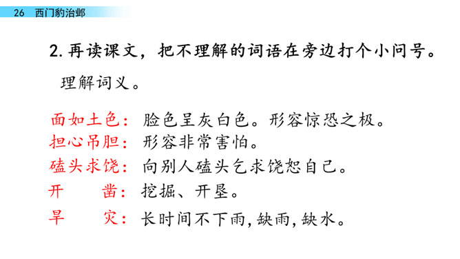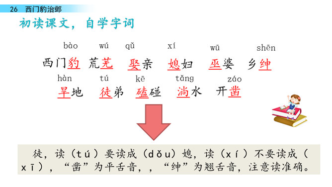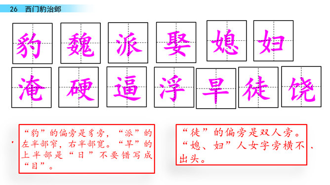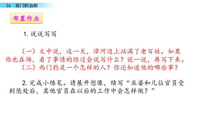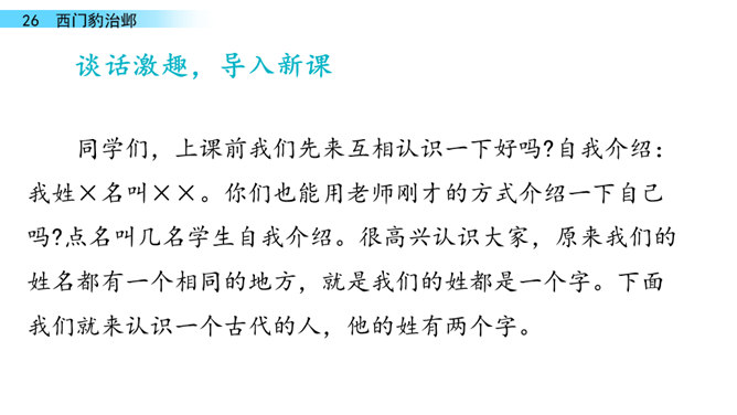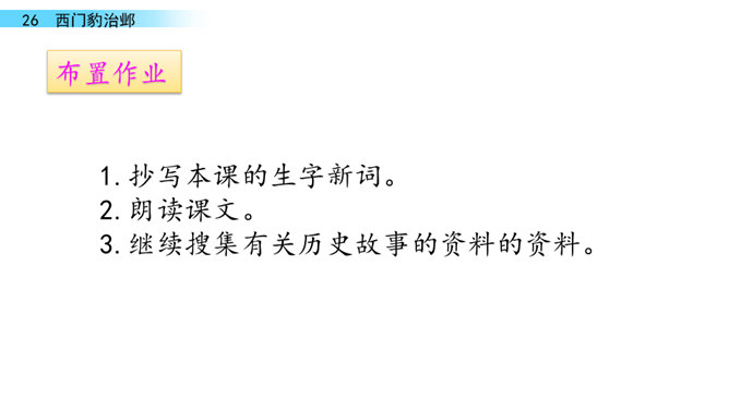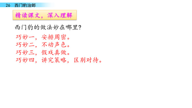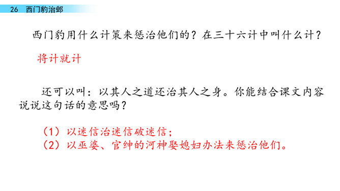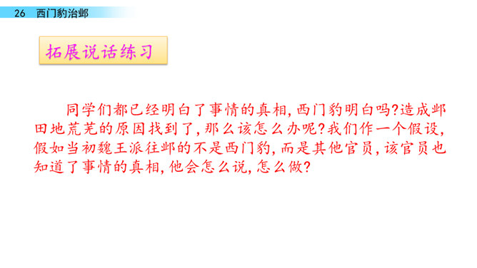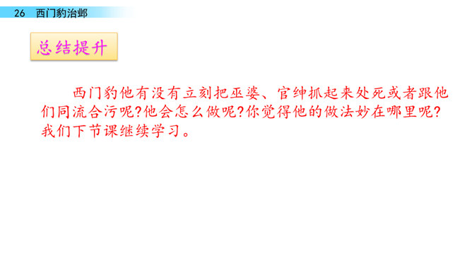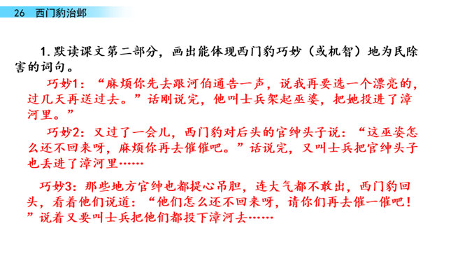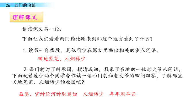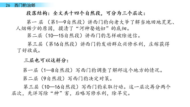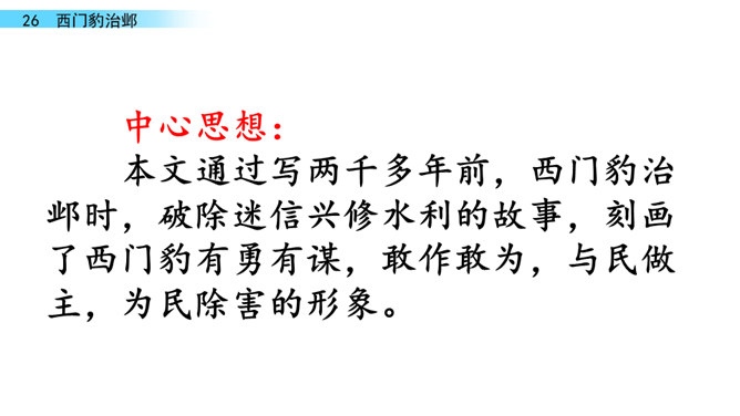 中心思想:本文通过写两千多年前,西门豹治邺时,破除迷信兴修水利的故事,刻画了西门豹有勇有谋,敢作敢为,与民做主,为民除害的形象。段落结构:全文共十四个自然段,可分为三个层次:第一层(第1—9自然段)讲西门豹向老大爷了解当地田地荒芜、人烟稀少的原因,摸清了“河神娶媳妇”的底细。第二层(10—15自然段)讲西门豹怎样破除迷信。第三层(第16自然段)讲西门豹发动群众兴修水利,庄稼获得了好收成。所属专题:西门豹治邺ppt。