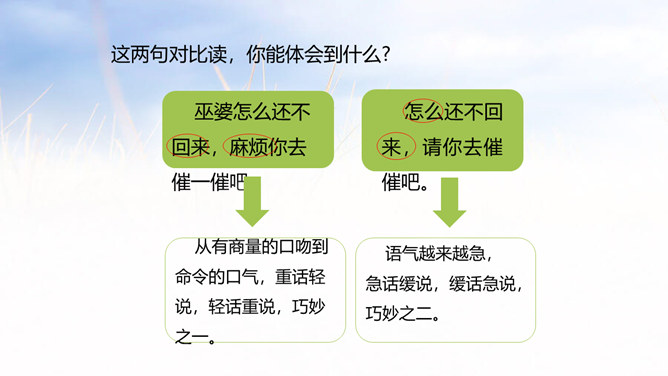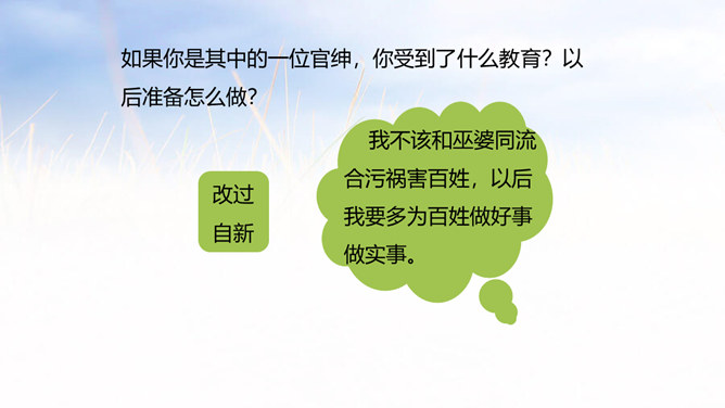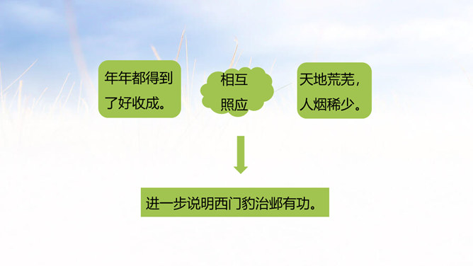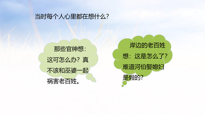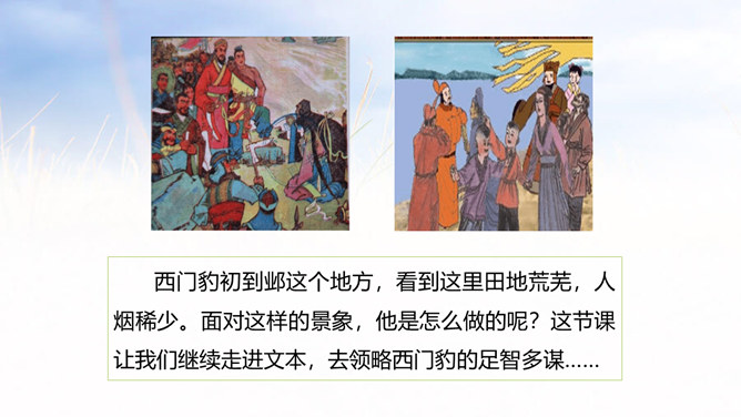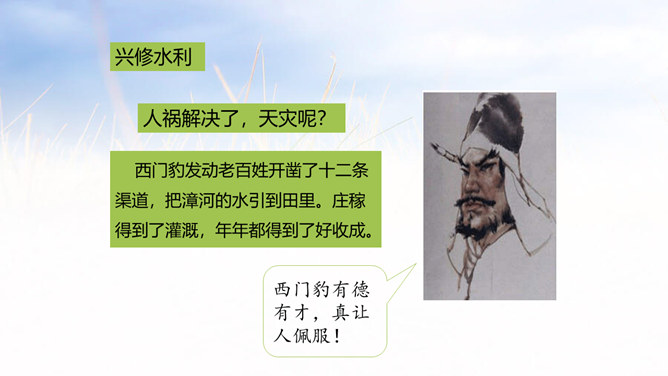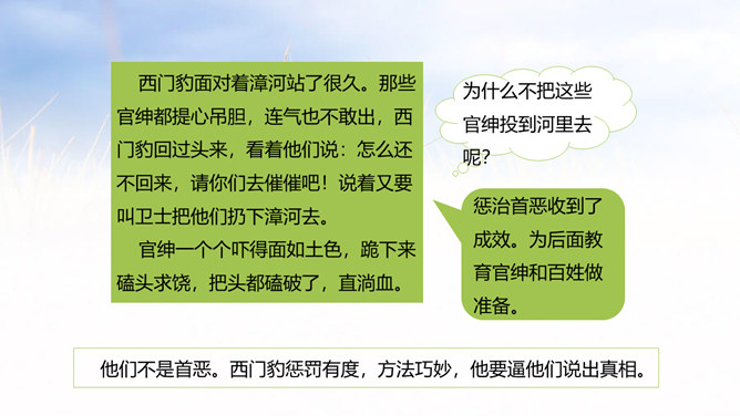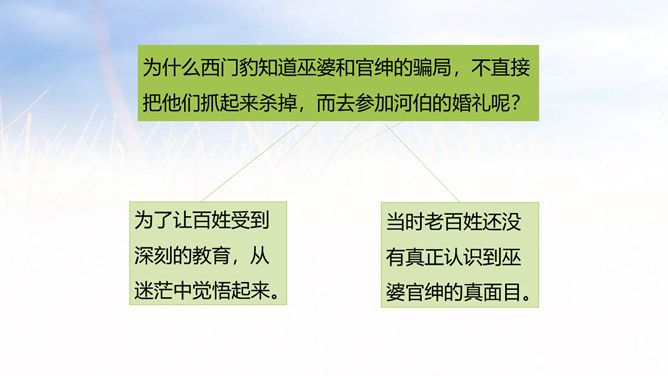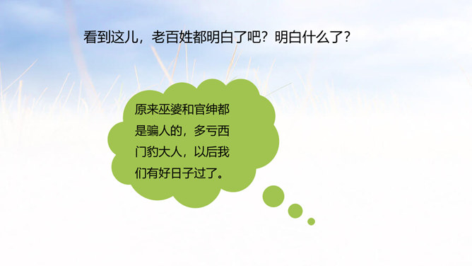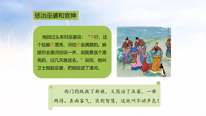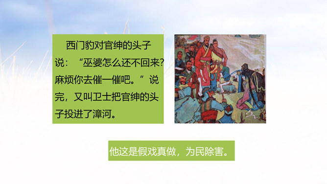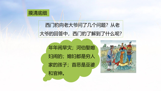 西门豹向老大爷问了几个问题?从老大爷的回答中,西门豹了解到了什么呢?年年闹旱灾;河伯娶媳妇闹的;媳妇都是穷人家的孩子;首恶是巫婆和官绅。朗读这一部分时,要把三个“不”读得特别坚决,“麻烦”“漂亮”要读出客气而又含有命令的语气。这两句对比读,你能体会到什么?从有商量的口吻到命令的口气,重话轻说,轻话重说,巧妙之一。语气越来越急,急话缓说,缓话急说,巧妙之二。所属专题:西门豹治邺ppt。