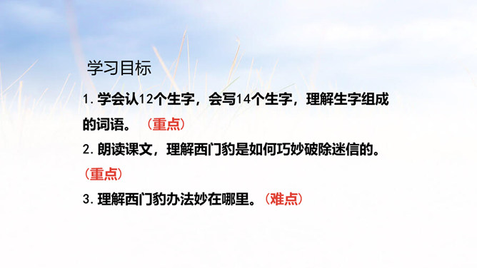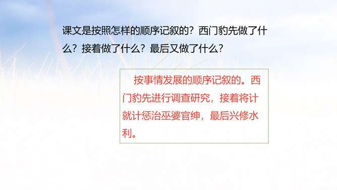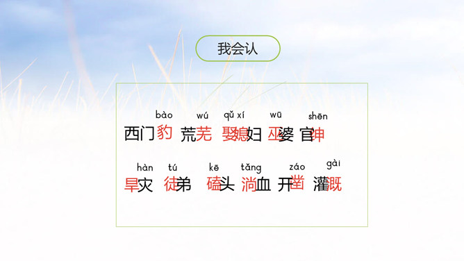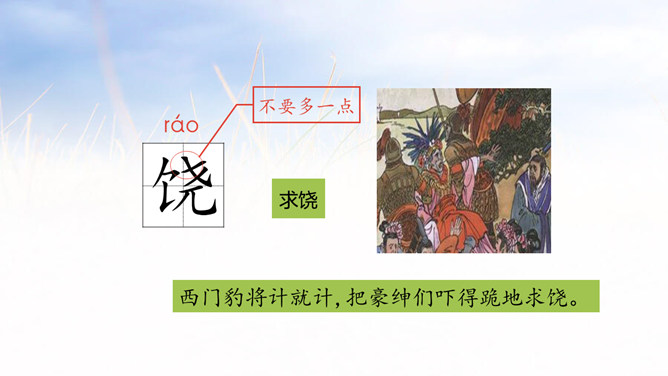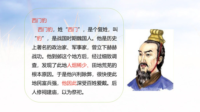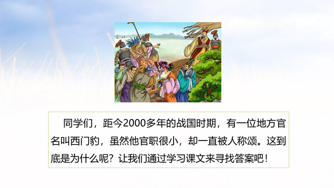 1.学会认12个生字,会写14个生字,理解生字组成的词语。 (重点)2.朗读课文,理解西门豹是如何巧妙破除迷信的。 (重点)3.理解西门豹办法妙在哪里。(难点)同学们,距今2000多年的战国时期,有一位地方官名叫西门豹,虽然他官职很小,却一直被人称颂。这到底是为什么呢?让我们通过学习课文来寻找答案吧!自由朗读课文,文中哪个句子给你的留下的印象最深刻? 自由朗读课文,想一想,课文主要写了一件什么事?所属专题:西门豹治邺ppt。