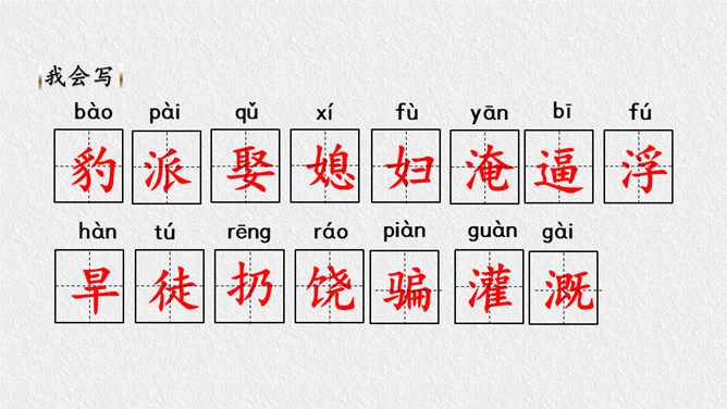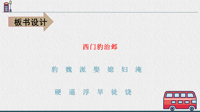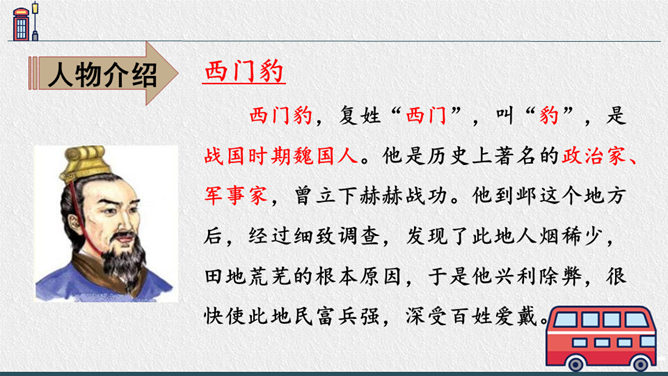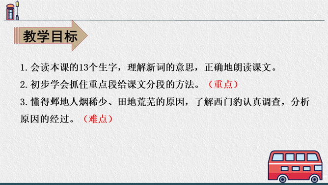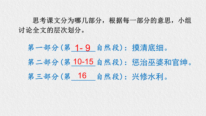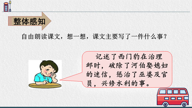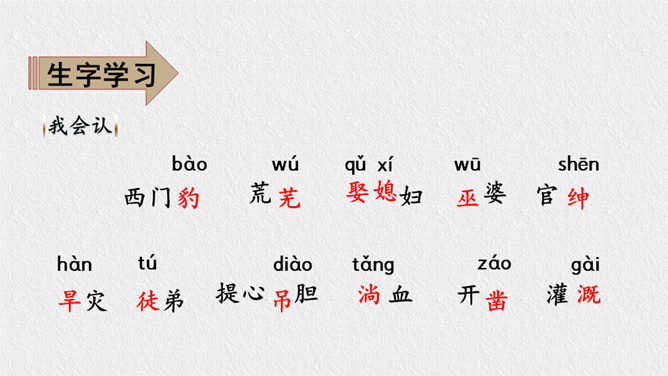 会读本课的13个生字,理解新词的意思,正确地朗读课文。初步学会抓住重点段给课文分段的方法。(重点)懂得邺地人烟稀少、田地荒芜的原因,了解西门豹认真调查,分析原因的经过。(难点)会认13个生字,会写12个生字。(重点)正确、流利、有感情地朗读课文。理清流利、有感情地朗读课文(重点)自由朗读课文,想一想,课文主要写了一件什么事?记述了西门豹在治理邺时,破除了河伯娶媳妇的迷信,惩治了巫婆及官员,兴修水利的事。所属专题:西门豹治邺ppt。