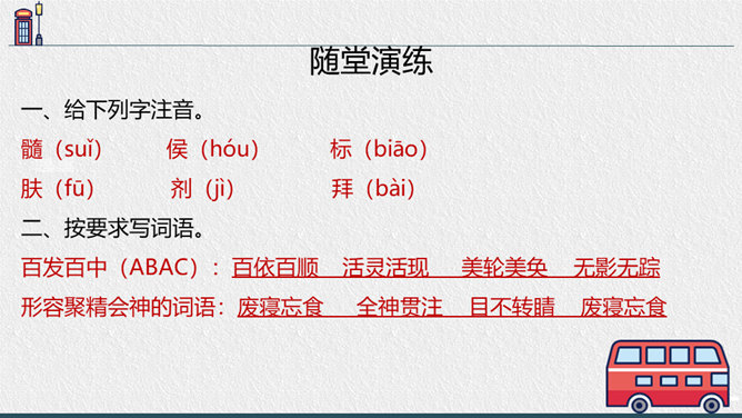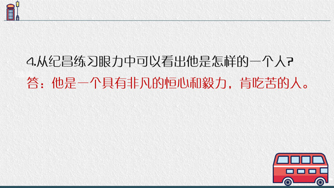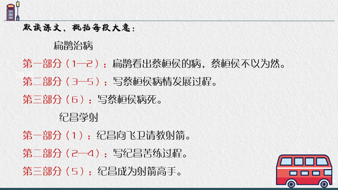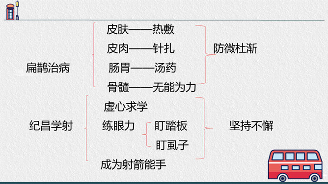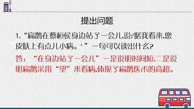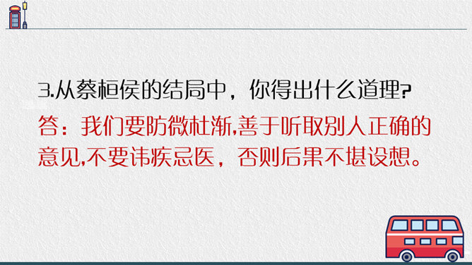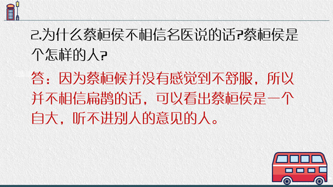 1.“扁鹊在蔡桓侯身边站了一会儿,说:'据我看来,您皮肤上有点儿小病。' ”一句可以读出什么?答:“在身边站了一会儿”一是说明时间短,二是说明扁鹊采用“望”来看病,体现了扁鹊医术的高超。2.为什么蔡桓侯不相信名医说的话?蔡桓侯是个怎样的人?答:因为蔡桓候并没有感觉到不舒服,所以并不相信扁鹊的话,可以看出蔡桓侯是一个自大,听不进别人的意见的人。3.从蔡桓侯的结局中,你得出什么道理?答:我们要防微杜渐,善于听取别人正确的意见,不要讳疾忌医,否则后果不堪设想。