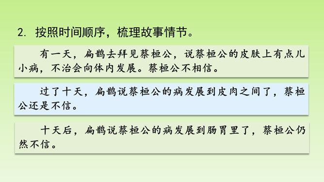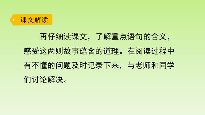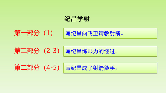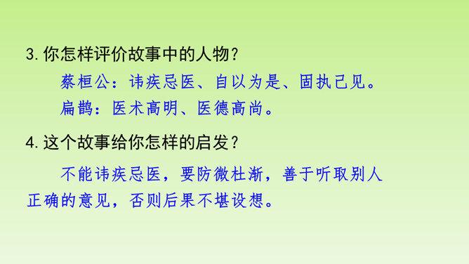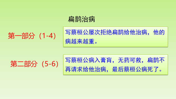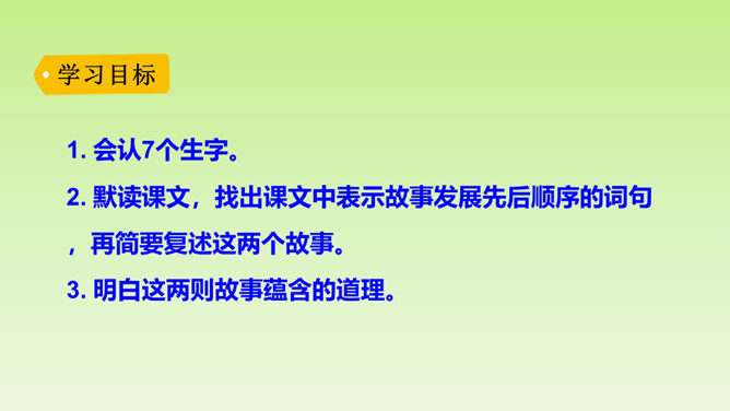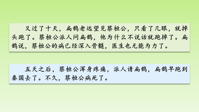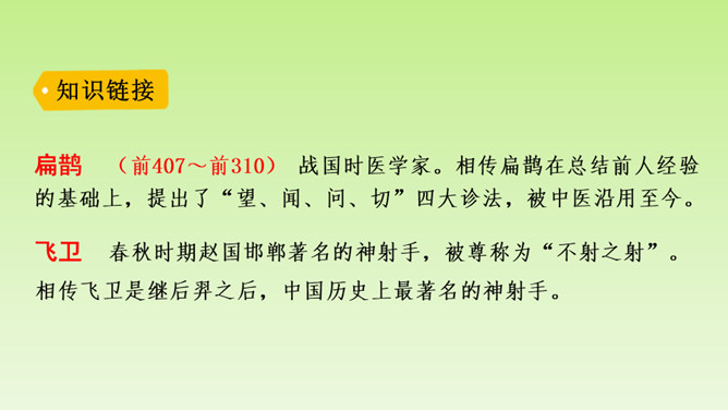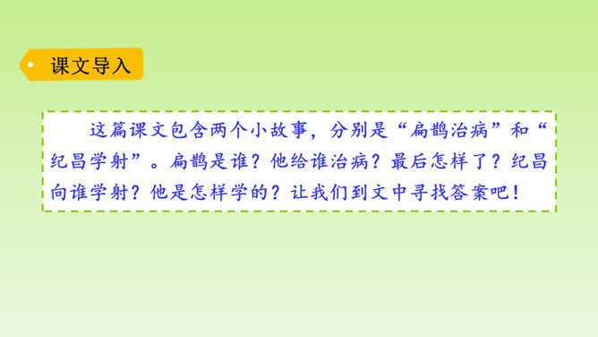 这篇课文包含两个小故事,分别是“扁鹊治病”和“纪昌学射”。扁鹊是谁?他给谁治病?最后怎样了?纪昌向谁学射?他是怎样学的?让我们到文中寻找答案吧!1. 会认7个生字。2. 默读课文,找出课文中表示故事发展先后顺序的词句,再简要复述这两个故事。3. 明白这两则故事蕴含的道理。再仔细读课文,了解重点语句的含义,感受这两则故事蕴含的道理。在阅读过程中有不懂的问题及时记录下来,与老师和同学们讨论解决。
