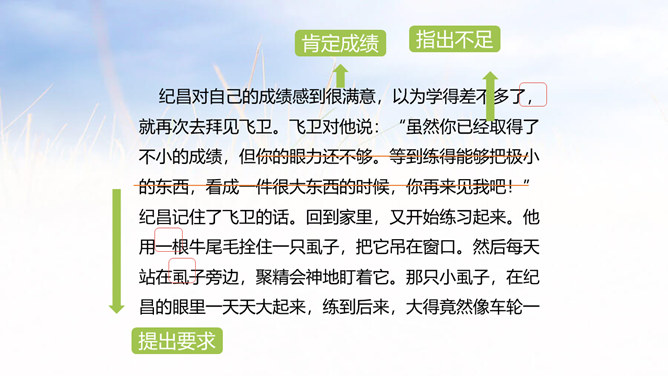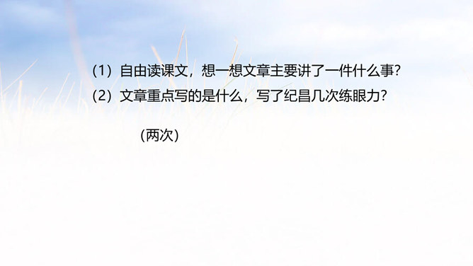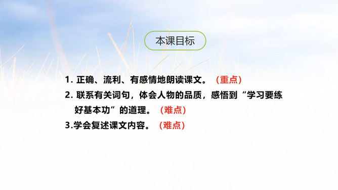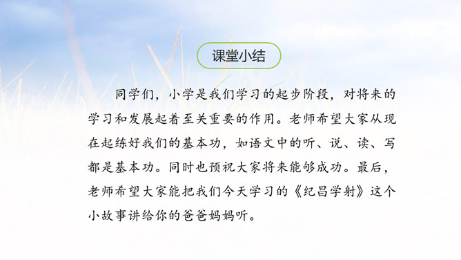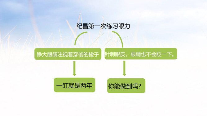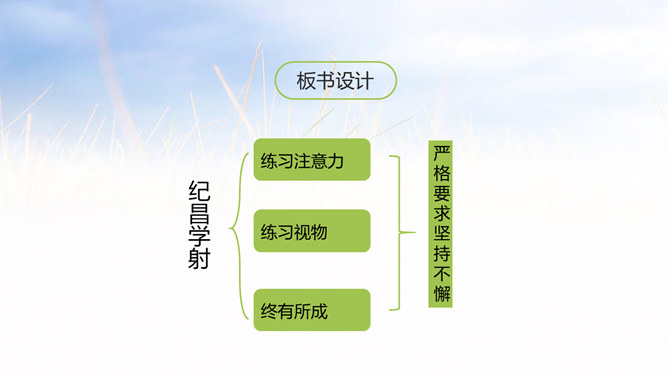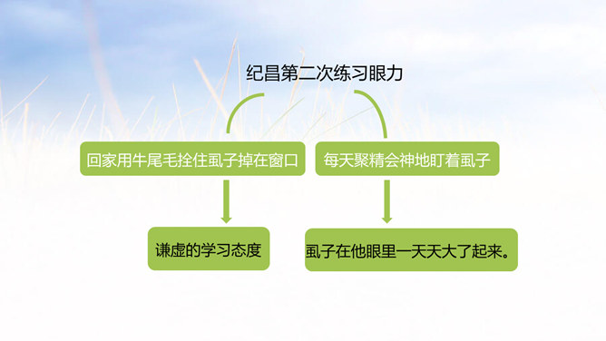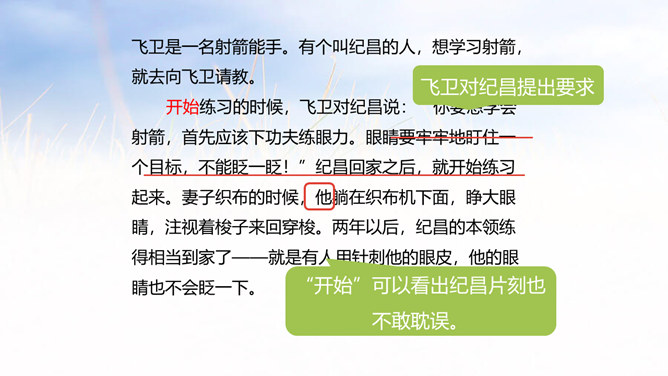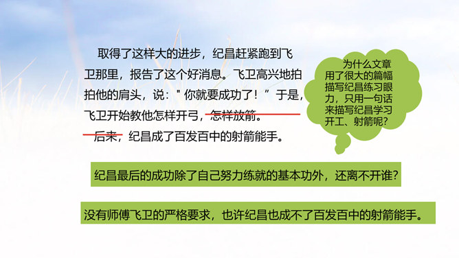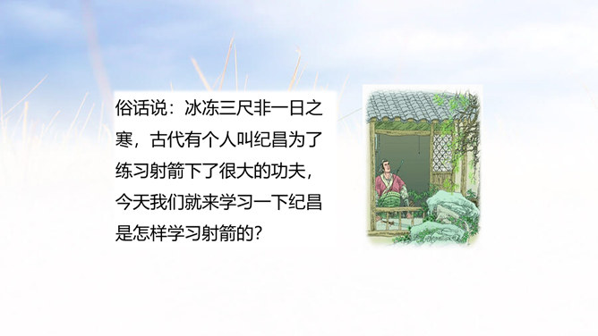 俗话说:冰冻三尺非一日之寒,古代有个人叫纪昌为了练习射箭下了很大的功夫,今天我们就来学习一下纪昌是怎样学习射箭的?1. 正确、流利、有感情地朗读课文。(重点)2. 联系有关词句,体会人物的品质,感悟到“学习要练好基本功”的道理。(难点)3.学会复述课文内容。(难点)一开始飞卫是怎么教的?给纪昌提出了什么要求?那纪昌面对师傅的严格要求,又是怎样做的呢?纪昌第一次是怎样练习眼力的?所属专题:纪昌学射ppt。