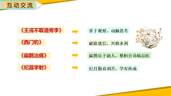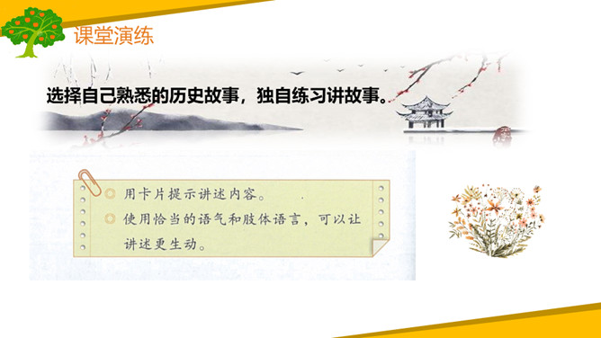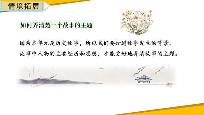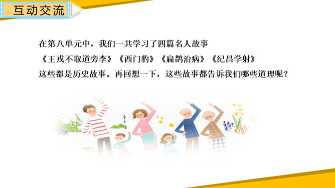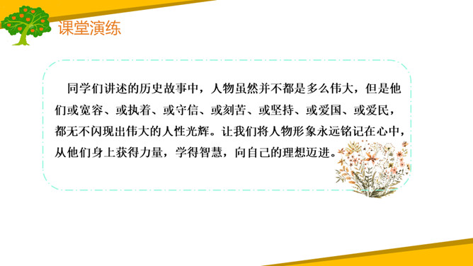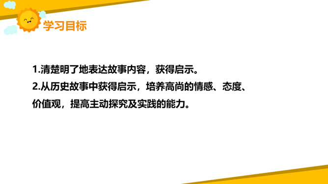 同学们讲述的历史故事中,人物虽然并不都是多么伟大,但是他们或宽容、或执着、或守信、或刻苦、或坚持、或爱国、或爱民,都无不闪现出伟大的人性光辉。让我们将人物形象永远铭记在心中,从他们身上获得力量,学得智慧,向自己的理想迈进。1.清楚明了地表达故事内容,获得启示。2.从历史故事中获得启示,培养高尚的情感、态度、价值观,提高主动探究及实践的能力。所属专题:讲历史故事ppt。