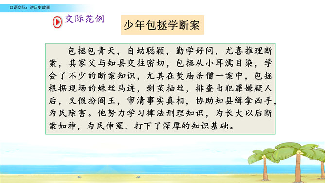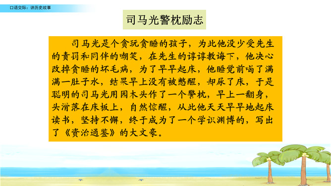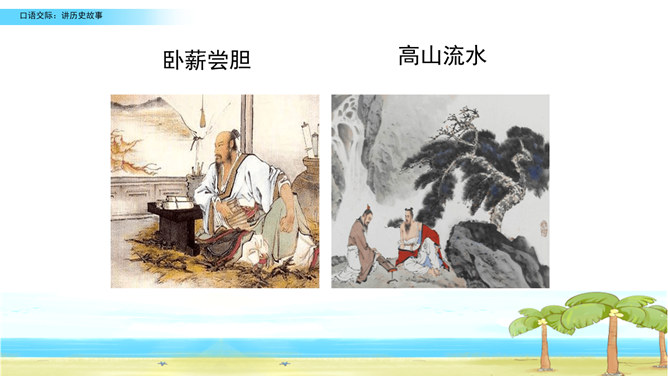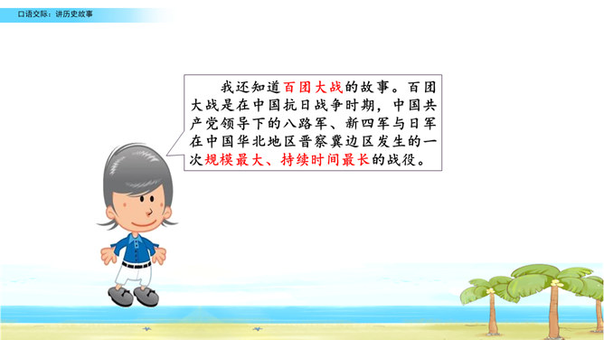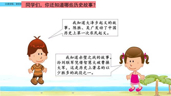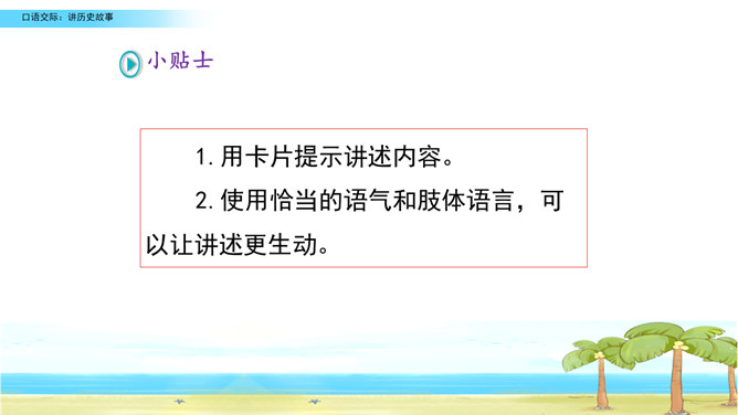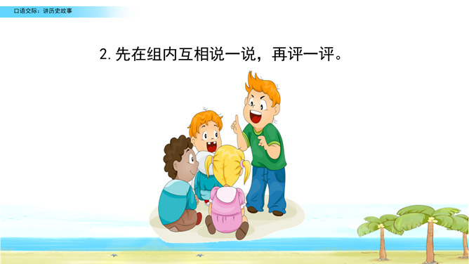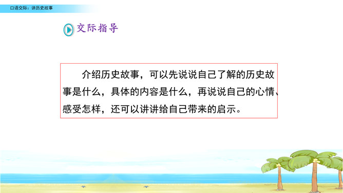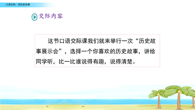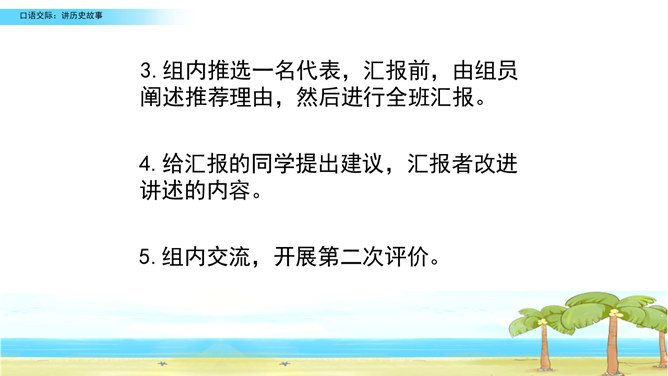 介绍历史故事,可以先说说自己了解的历史故事是什么,具体的内容是什么,再说说自己的心情、感受怎样,还可以讲讲给自己带来的启示。.提出要求:(1)先想好了再说,注意叙述的顺序;(2)态度自然大方,尽量把事情说清楚,说具体,说有趣;(3)声音要洪亮。2.先在组内互相说一说,再评一评。3.组内推选一名代表,汇报前,由组员阐述推荐理由,然后进行全班汇报。4.给汇报的同学提出建议,汇报者改进讲述的内容。所属专题:讲历史故事ppt。