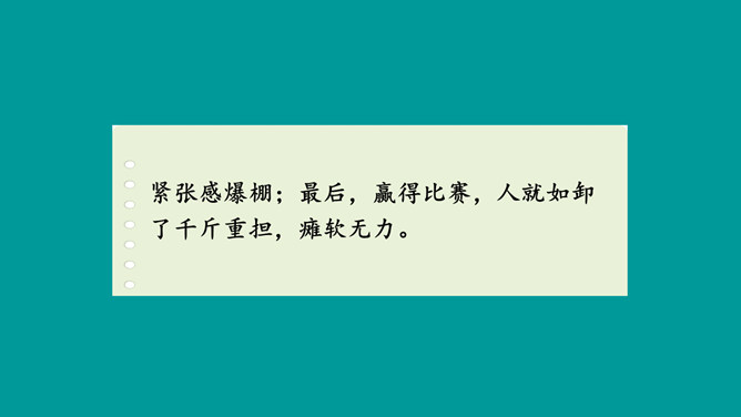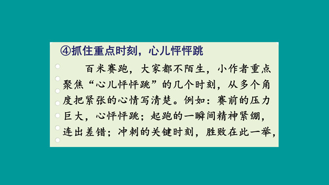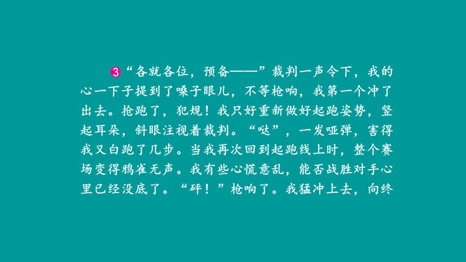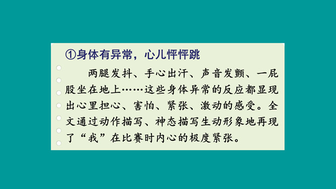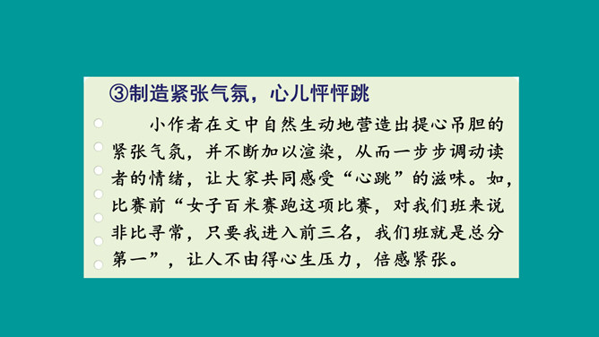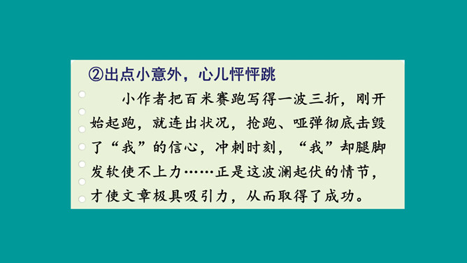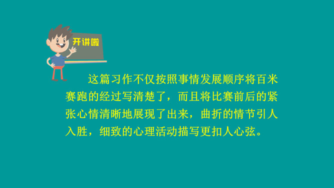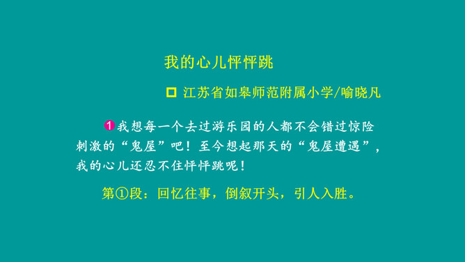 这篇习作不仅按照事情发展顺序将百米赛跑的经过写清楚了,而且将比赛前后的紧张心情清晰地展现了出来,曲折的情节引人入胜,细致的心理活动描写更扣人心弦。小作者在文中自然生动地营造出提心吊胆的紧张气氛,并不断加以渲染,从而一步步调动读者的情绪,让大家共同感受“心跳”的滋味。鬼屋探险真是“一波未平,一波又起”,直让人大呼刺激。正是这波澜起伏的情节,才使文章极具吸引力,从而获得了大家的认可。所属专题:我的心儿怦怦跳ppt。