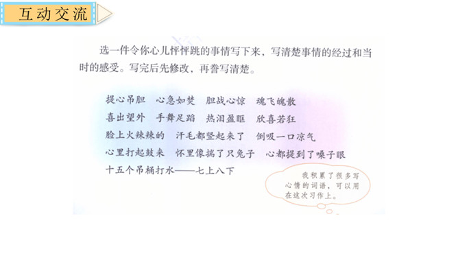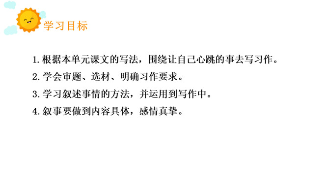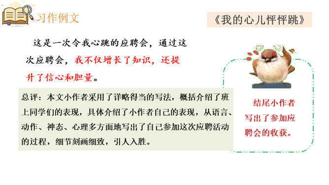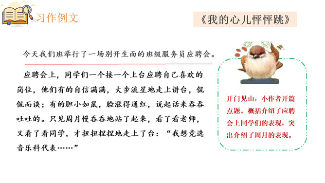 1.根据本单元课文的写法,围绕让自己心跳的事去写习作。2.学会审题、选材、明确习作要求。3.学习叙述事情的方法,并运用到写作中。4.叙事要做到内容具体,感情真挚。开门见山,小作者开篇点题。概括介绍了应聘会上同学们的表现,突出介绍了周月的表现。小作者细致刻画出自己的动作、语言、神态和心理活动以及他人的神态和动作,读来令人身临其境。结尾小作者写出了参加应聘会的收获。所属专题:我的心儿怦怦跳ppt。