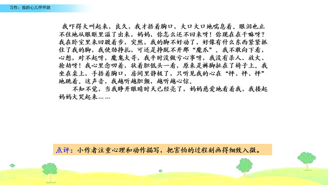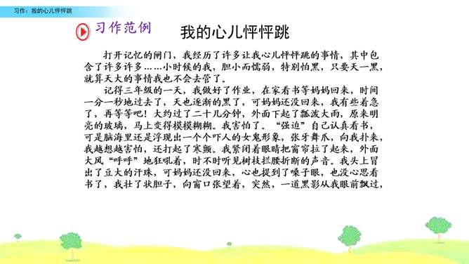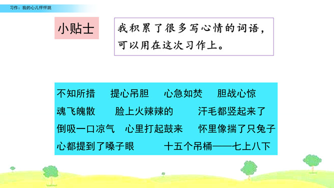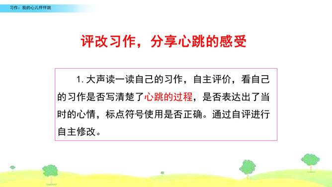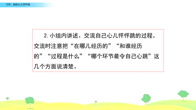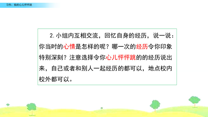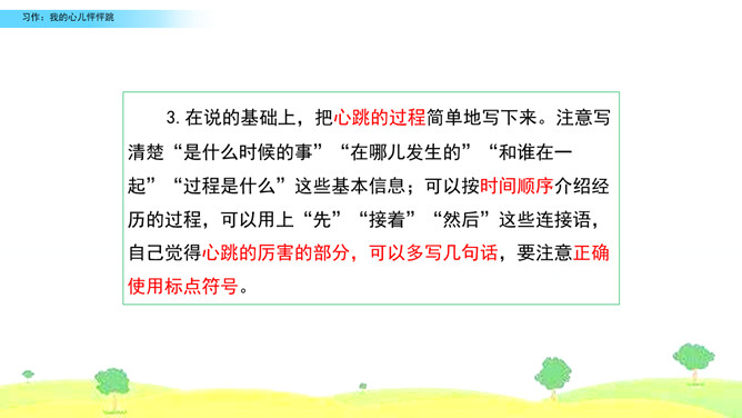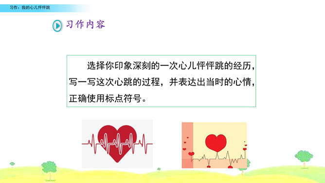 选择你印象深刻的一次心儿怦怦跳的经历,写一写这次心跳的过程,并表达出当时的心情,正确使用标点符号。观察右边的插图,说说图中的小朋友在干什么,感受心儿怦怦跳的心情,并了解本次习作的话题是“我的心儿怦怦跳”。小组内互相交流,回忆自身的经历,说一说:你当时的心情是怎样的呢?哪一次的经历令你印象特别深刻?注意选择令你心儿怦怦跳的的经历说出来,自己或者和别人一起经历的都可以,地点校内校外都可以。所属专题:我的心儿怦怦跳ppt。