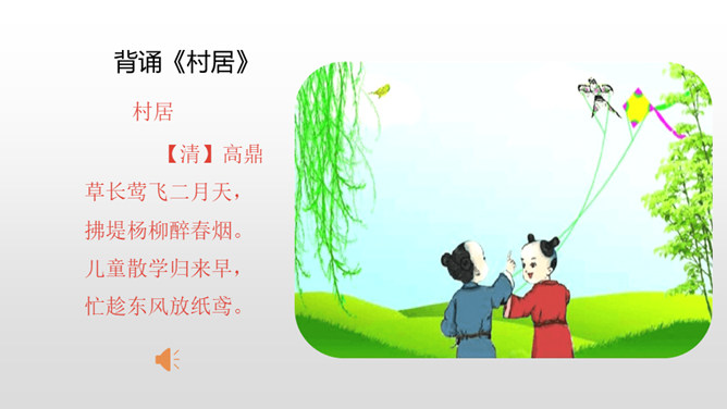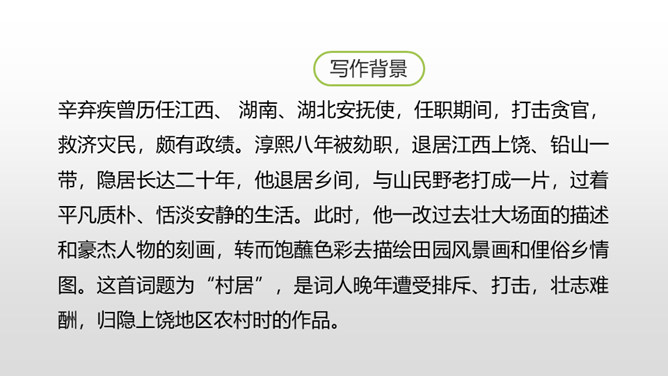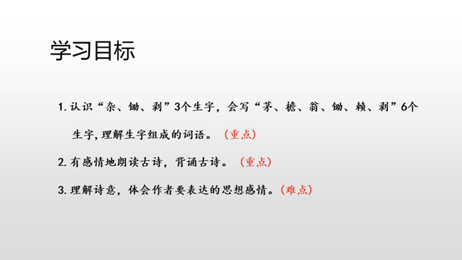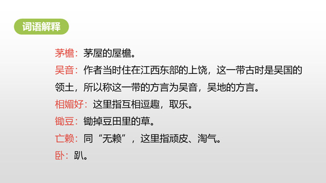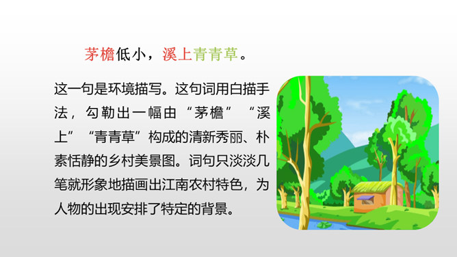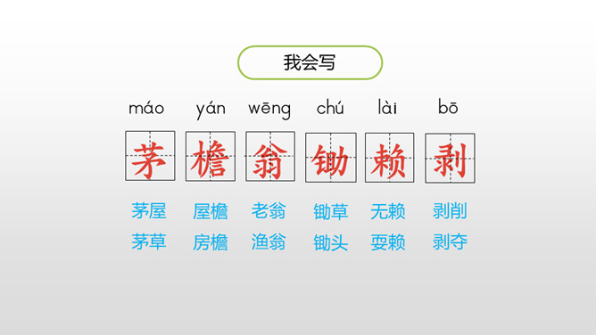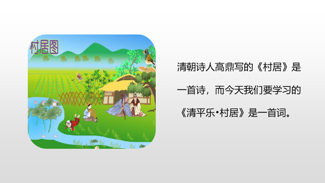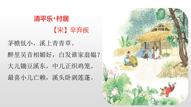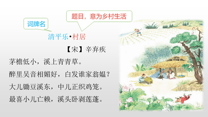 1.认识“杂、锄、剥”3个生字,会写“茅、檐、翁、锄、赖、剥”6个生字,理解生字组成的词语。 (重点)2.有感情地朗读古诗,背诵古诗。 (重点)3.理解诗意,体会作者要表达的思想感情。(难点)清朝诗人高鼎写的《村居》是一首诗,而今天我们要学习的《清平乐•村居》是一首词。词,又称为“诗余” “长短句”。它兴起于南朝,成形于晚唐,盛行于宋代;最早是一种配乐歌唱的诗,所以每首词都必须按一定的歌谱填写,这歌谱叫词牌。