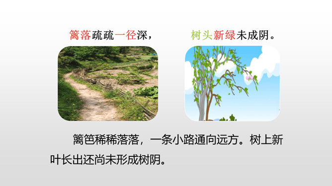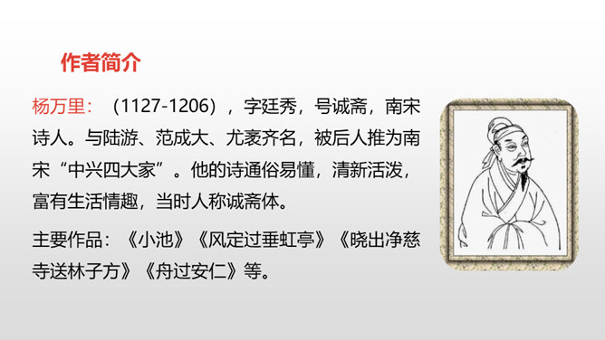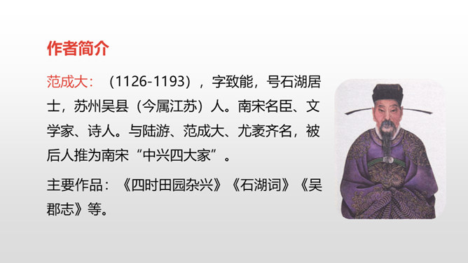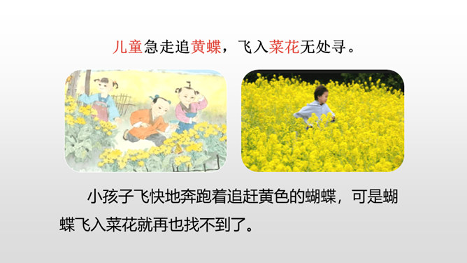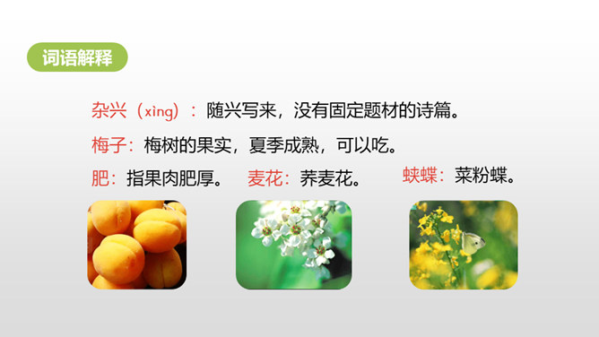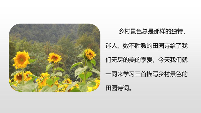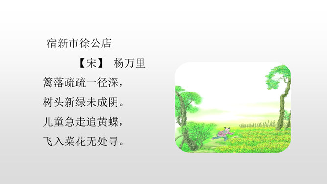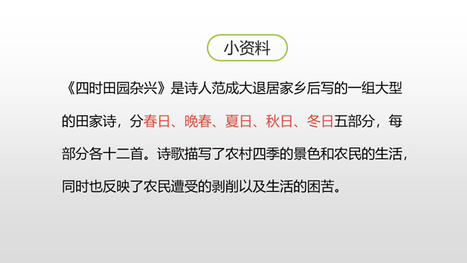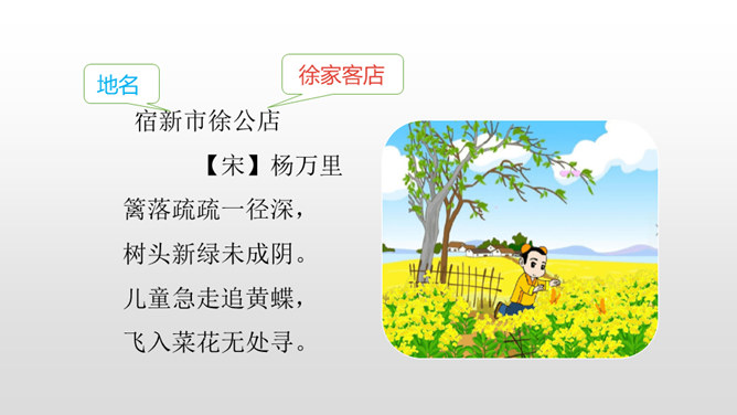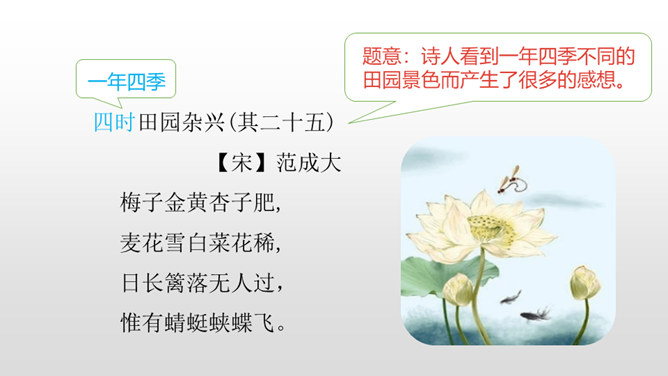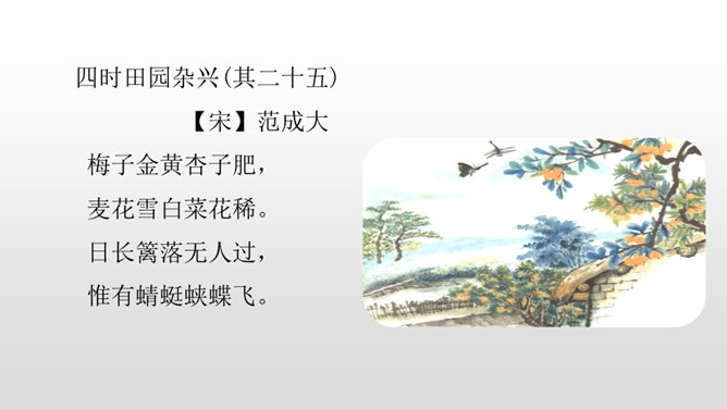 乡村景色总是那样的独特、迷人。数不胜数的田园诗给了我们无尽的美的享爱,今天我们就一同来学习三首描写乡村景色的田园诗词。《四时田园杂兴》是诗人范成大退居家乡后写的一组大型的田家诗,分春日、晚春、夏日、秋日、冬日五部分,每部分各十二首。诗歌描写了农村四季的景色和农民的生活,同时也反映了农民遭受的剥削以及生活的困苦。《宿新市徐公店》这首诗描绘了在幽静安逸的田园风光里,儿童在菜花地里追逐蝴蝶的生动画面,表达了诗人对美丽田园春色的赞美和对儿童的喜爱之情。