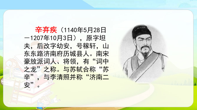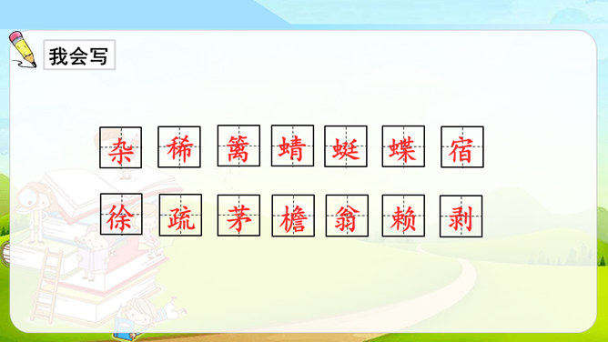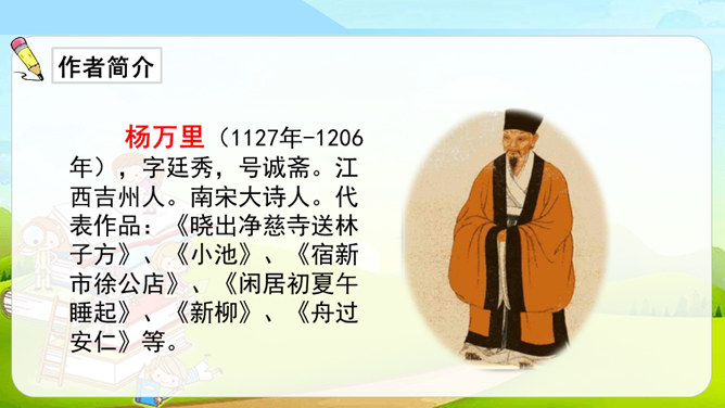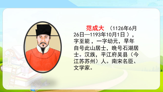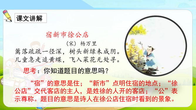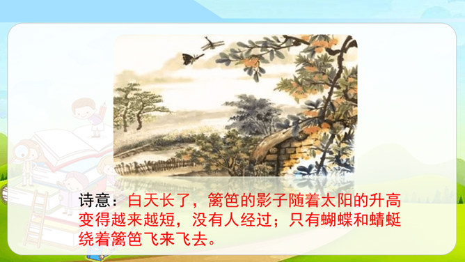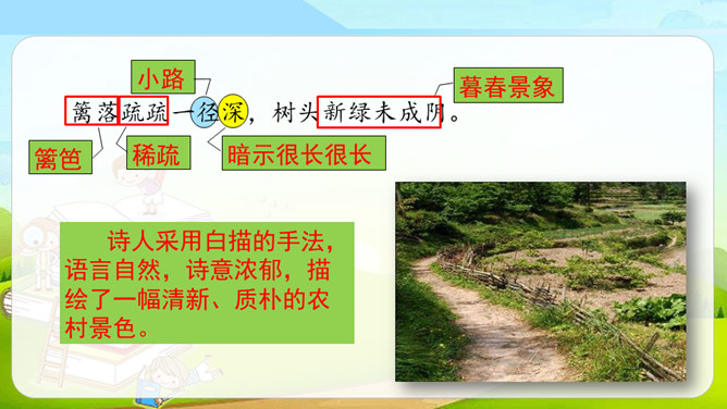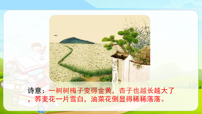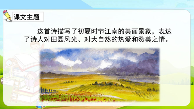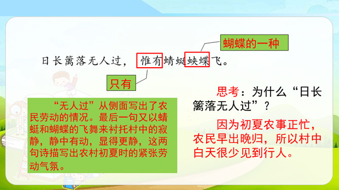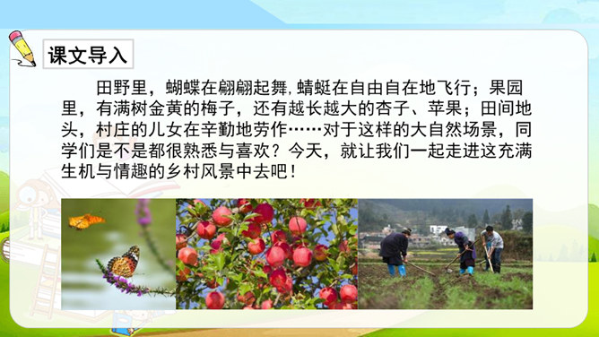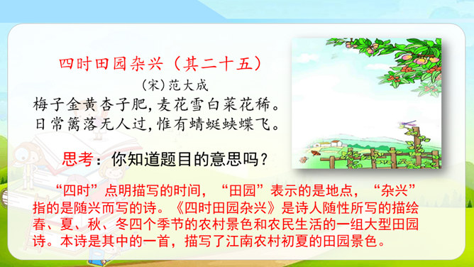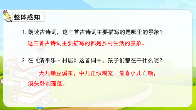 田野里,蝴蝶在翩翩起舞,蜻蜓在自由自在地飞行;果园里,有满树金黄的梅子,还有越长越大的杏子、苹果;田间地头,村庄的儿女在辛勤地劳作……对于这样的大自然场景,同学们是不是都很熟悉与喜欢?今天,就让我们一起走进这充满生机与情趣的乡村风景中去吧!1.朗读古诗词,这三首古诗词主要描写的是哪里的景象?这三首古诗词主要描写的都是乡村生活的景象。2.在《清平乐·村居》这首词中,孩子们都在干什么呢?大儿锄豆溪东,中儿正织鸡笼。最喜小儿亡赖,溪头卧剥莲蓬。