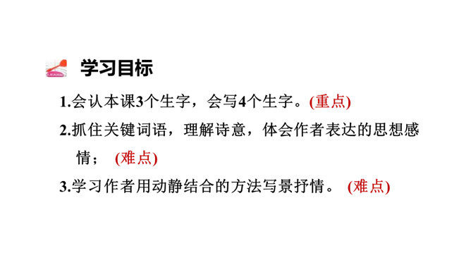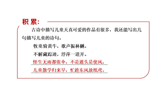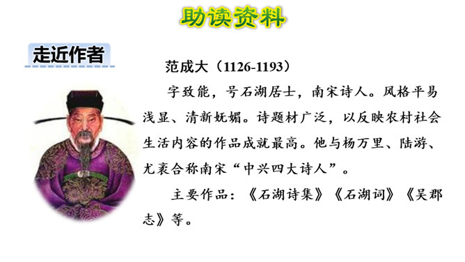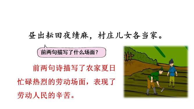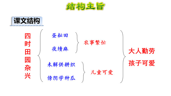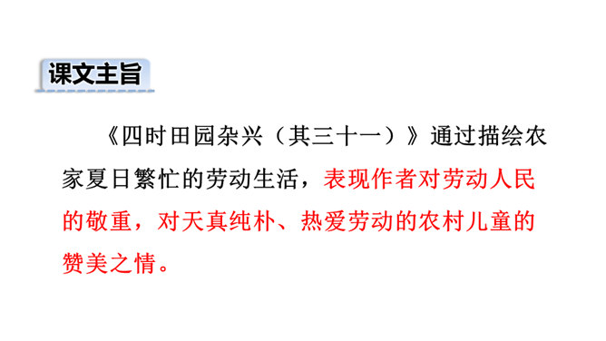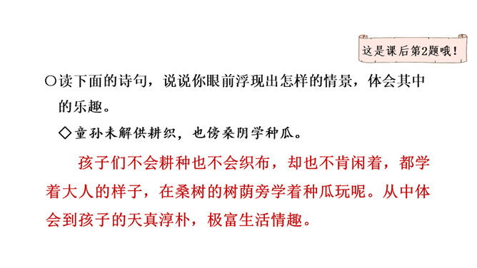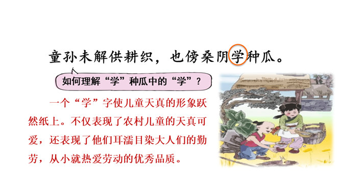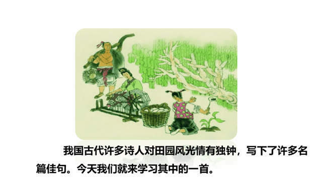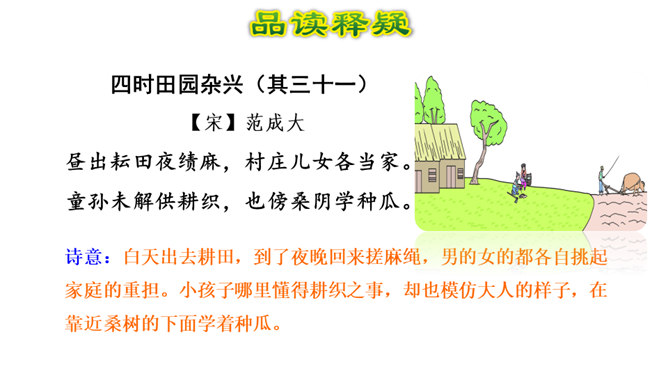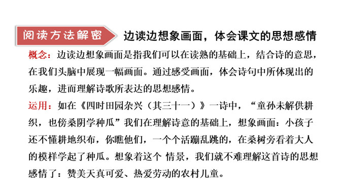 边读边想象画面,体会课文的思想感情。概念:边读边想象画面是指我们可以在读熟的基础上,结合诗的意思,在我们头脑中展现一幅画面。通过感受画面,体会诗句中所体现出的乐趣,进而理解诗歌所表达的思想感情。运用:如在《四时田园杂兴(其三十一)》一诗中,“童孙未解供耕织,也傍桑阴学种瓜”我们在理解诗意的基础上,想象画面:小孩子还不懂耕地织布,你瞧他们,一个个活蹦乱跳的,在桑树旁看着大人的模样学起了种瓜。所属专题:四时田园杂兴ppt。