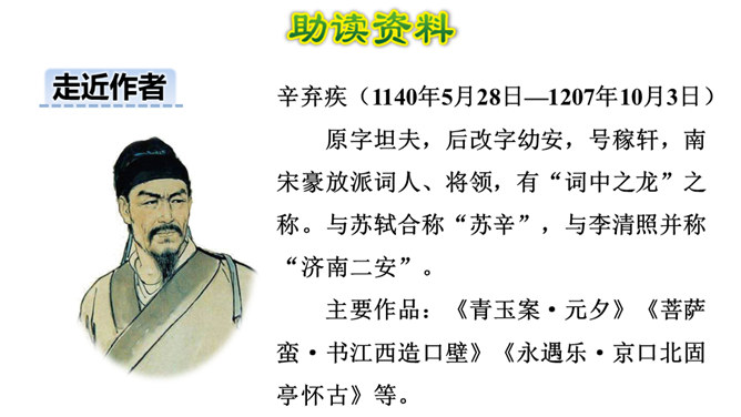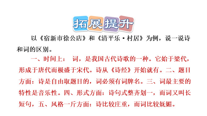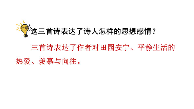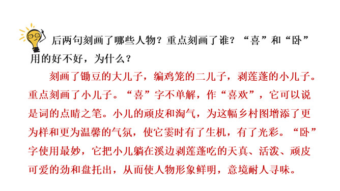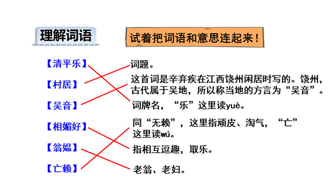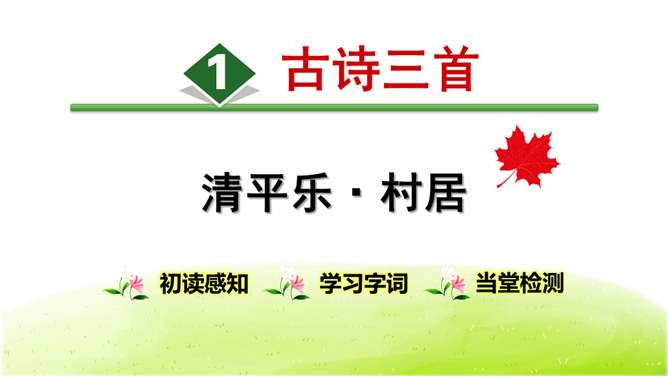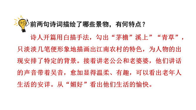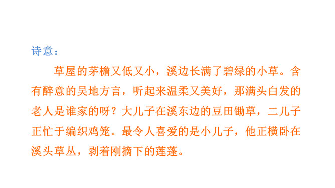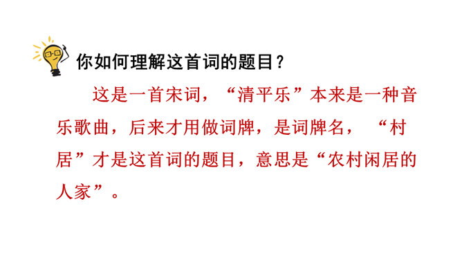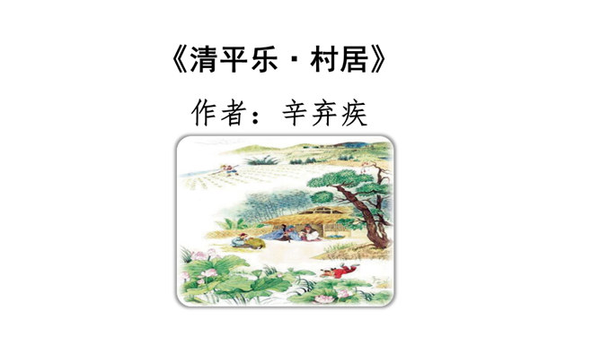 这是一首宋词,“清平乐”本来是一种音乐歌曲,后来才用做词牌,是词牌名, “村居”才是这首词的题目,意思是“农村闲居的人家”。诗人开篇用白描手法,勾出“茅檐”溪上”“青草”,只淡淡几笔便形象地描画出江南农村的特色,为人物的出现安排了特定的背景。接着讲老公公和老婆婆,他们讲话的声音带着吴音,愈加显得温柔、有趣,可以看出老年人生活的安详。从“媚好”看出他们生活的愉快。所属专题:清平乐村居ppt。