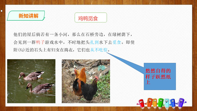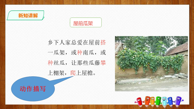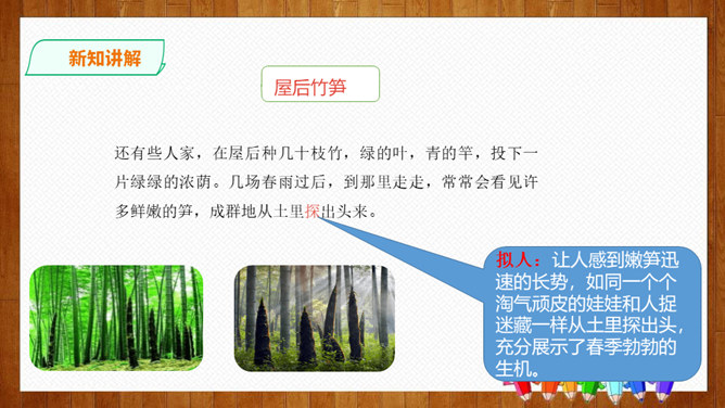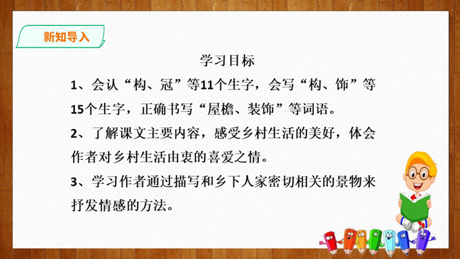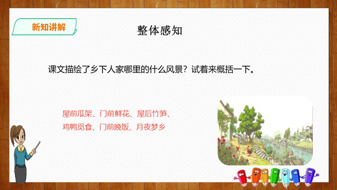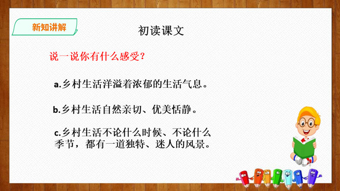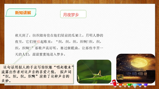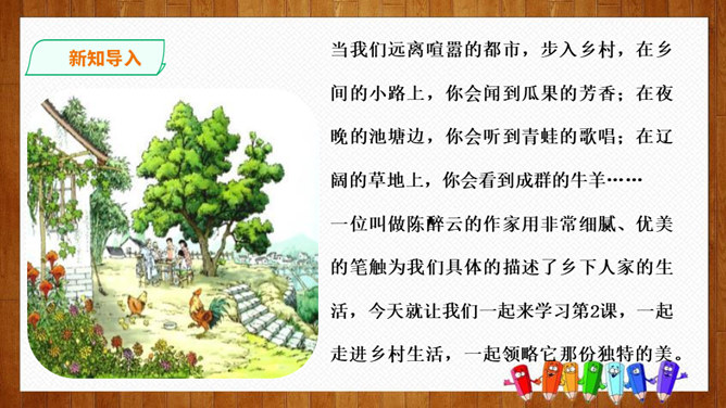 作者怎样通过描写普通的乡村景物来体现乡村的独特迷人?作者善于通过对普通的乡村事物拟人化的描写来体现乡村生活的独特迷人。如:①鲜嫩的竹笋成群地从土里探出头来。展示了春季勃勃的生机。②耸着尾巴的雄鸡在场地上大踏步地走来走去,具有浓厚的人情味。③纺织娘在月明人静的夜里便唱起歌来,渲染了乡村夜晚宁静祥和的气氛。把自己喜欢的段落背下来。有条件的同学课下走进乡下,去感受风景的独特迷人。所属专题:乡下人家ppt。