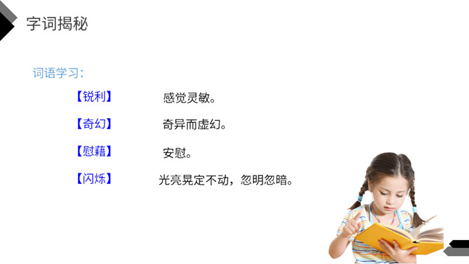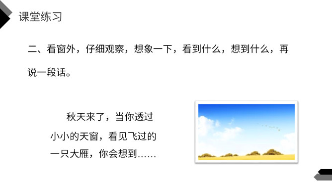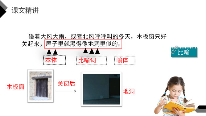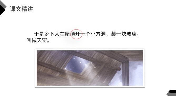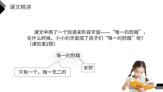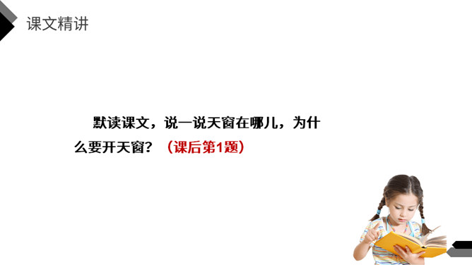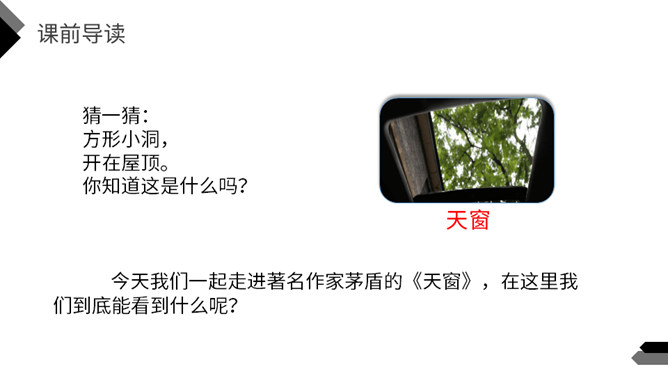 猜一猜:方形小洞,开在屋顶。你知道这是什么吗?今天我们一起走进著名作家茅盾的《天窗》,在这里我们到底能看到什么呢?默读课文,说一说天窗在哪儿,为什么要开天窗?(课后第1题)课文中用了一个短语来形容天窗——“唯一的慰藉”,在什么时候,小小的天窗成了孩子们“唯一的慰藉”呢?(课后第2题)看窗外,仔细观察,想象一下,看到什么,想到什么,再说一段话。所属专题:天窗ppt。