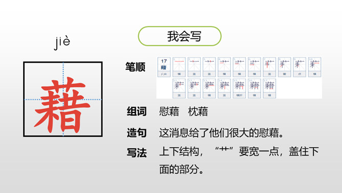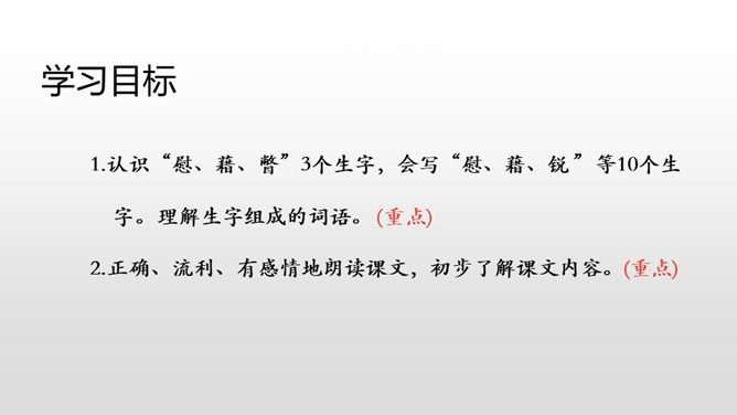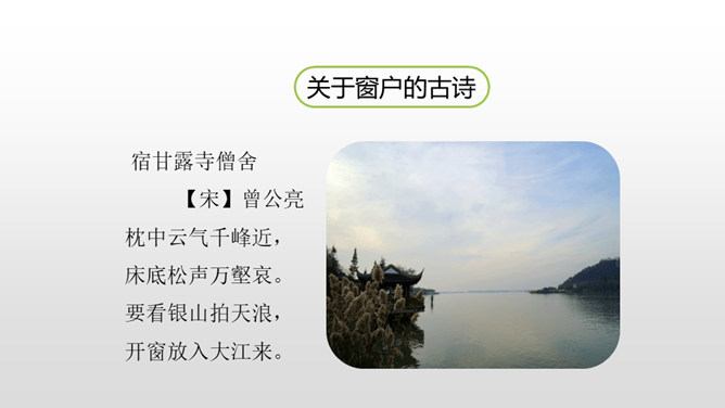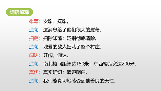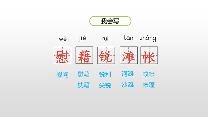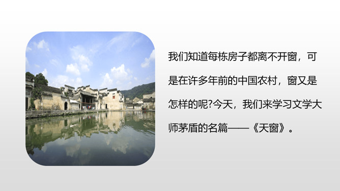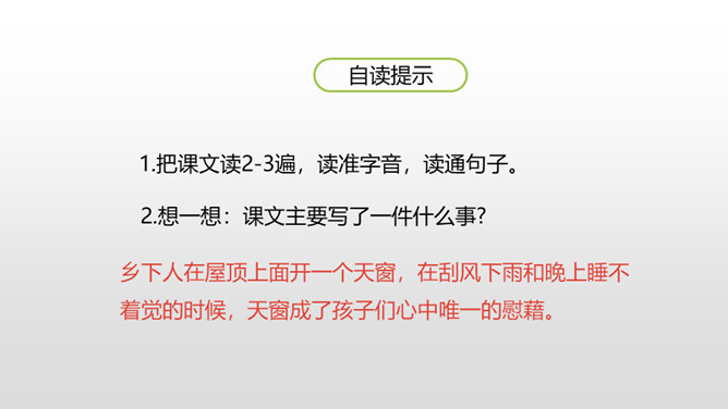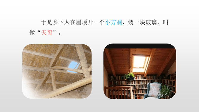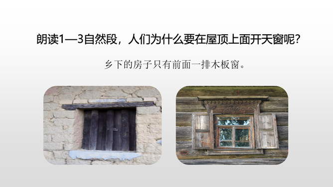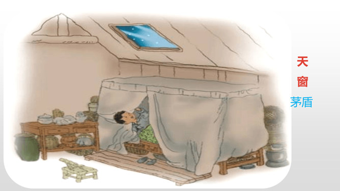 认识“慰、藉、瞥”3个生字,会写“慰、藉、锐 ”等10个生字。理解生字组成的词语。 (重点)正确、流利、有感情地朗读课文,初步了解课文内容。(重点)我们知道每栋房子都离不开窗,可是在许多年前的中国农村,窗又是怎样的呢?今天,我们来学习文学大师茅盾的名篇。把课文读2-3遍,读准字音,读通句子。想一想:课文主要写了一件什么事?乡下人在屋顶上面开一个天窗,在刮风下雨和晚上睡不着觉的时候,天窗成了孩子们心中唯一的慰藉。所属专题:天窗ppt。