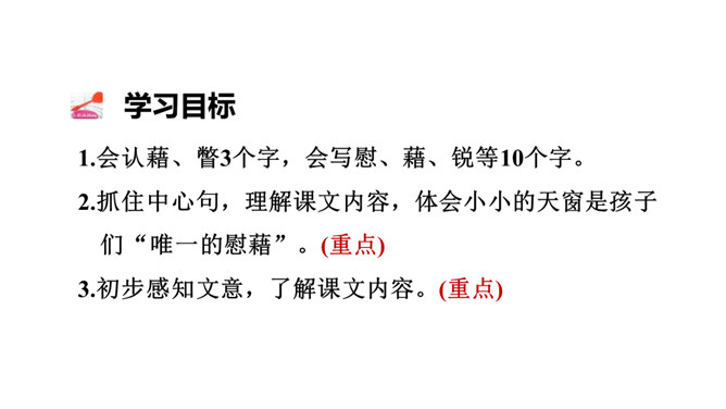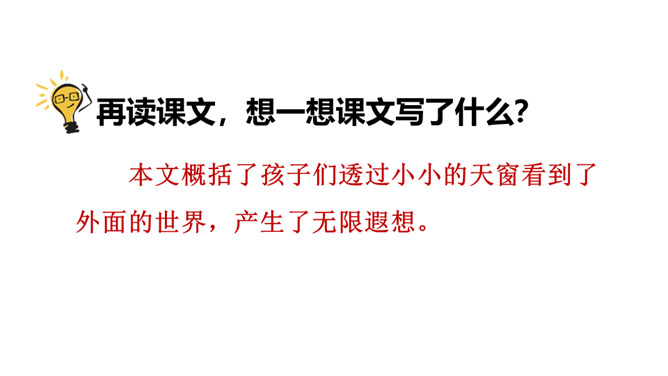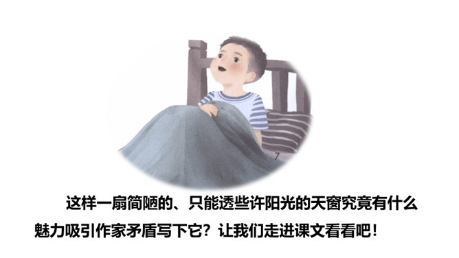 这样一扇简陋的、只能透些许阳光的天窗究竟有什么魅力吸引作家矛盾写下它?让我们走进课文看看吧!会认藉、瞥3个字,会写慰、藉、锐等10个字。抓住中心句,理解课文内容,体会小小的天窗是孩子们“唯一的慰藉”。(重点)初步感知文意,了解课文内容。(重点)再读课文,想一想课文写了什么?本文概括了孩子们透过小小的天窗看到了外面的世界,产生了无限遐想。读完这篇课文,让我们真切地感受到孩子们丰富的想象力与创造力。所属专题:天窗ppt。