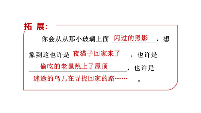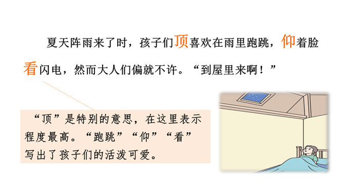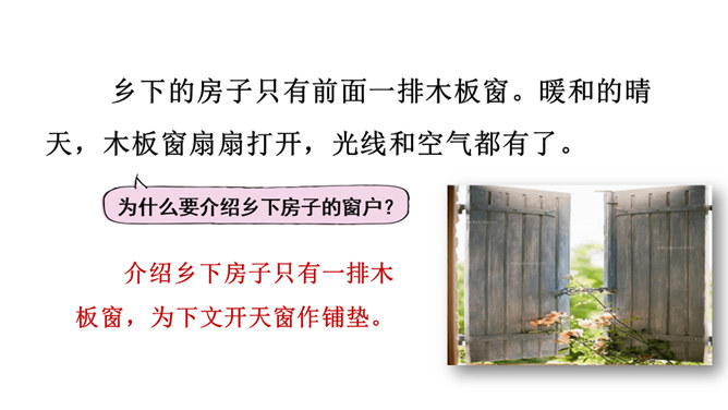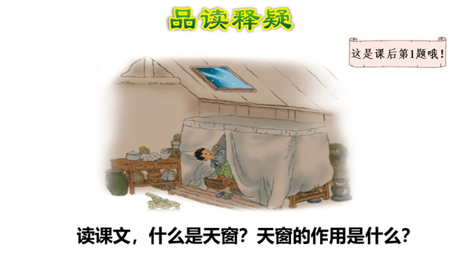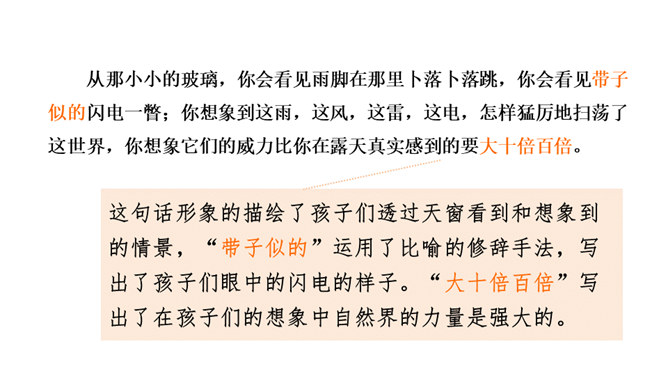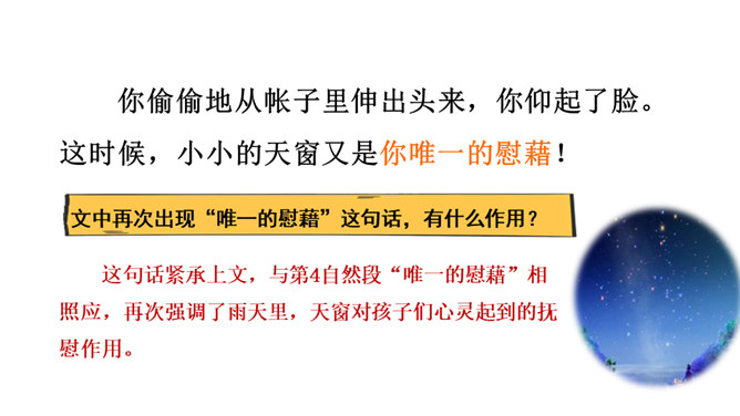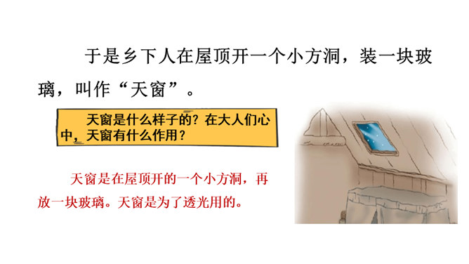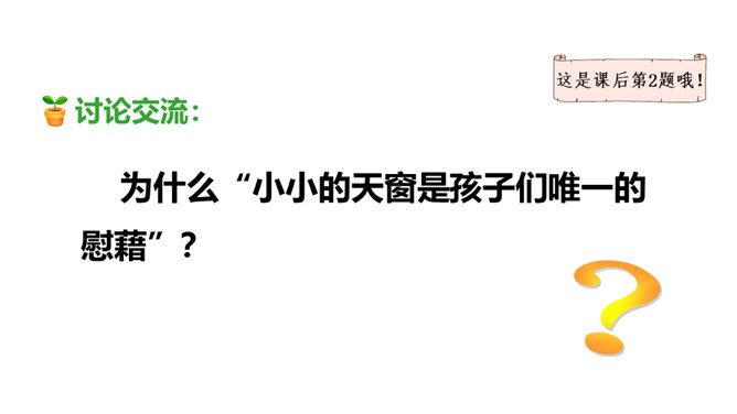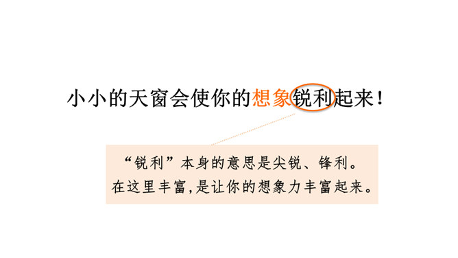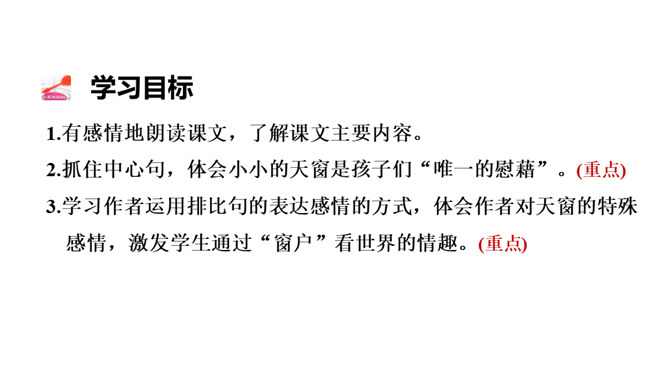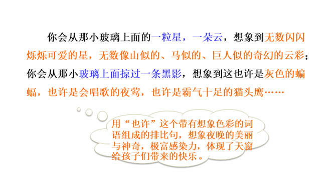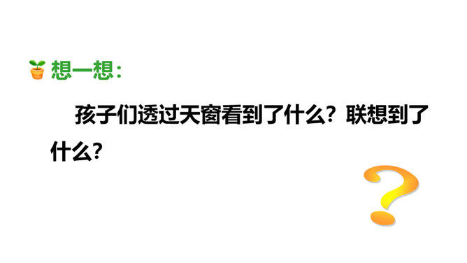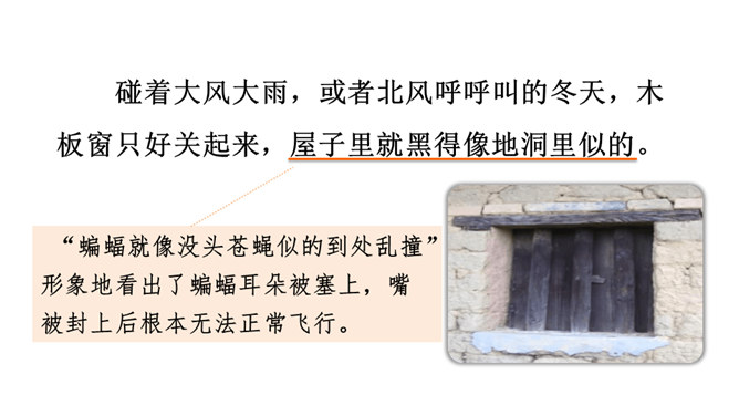 1.有感情地朗读课文,了解课文主要内容。2.抓住中心句,体会小小的天窗是孩子们“唯一的慰藉”。(重点)3.学习作者运用排比句的表达感情的方式,体会作者对天窗的特殊感情,激发学生通过“窗户”看世界的情趣。(重点)“蝙蝠就像没头苍蝇似的到处乱撞”形象地看出了蝙蝠耳朵被塞上,嘴被封上后根本无法正常飞行。“顶”是特别的意思,在这里表示程度最高。“跑跳”“仰”“看”写出了孩子们的活泼可爱。所属专题:天窗ppt。