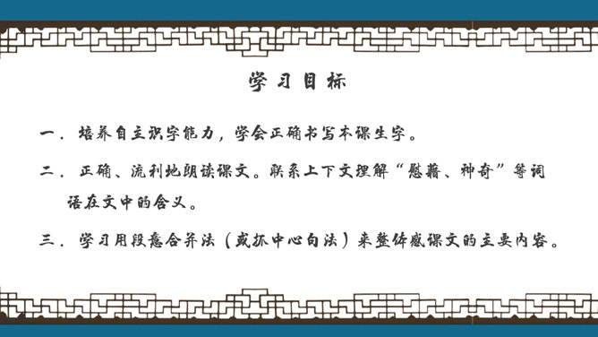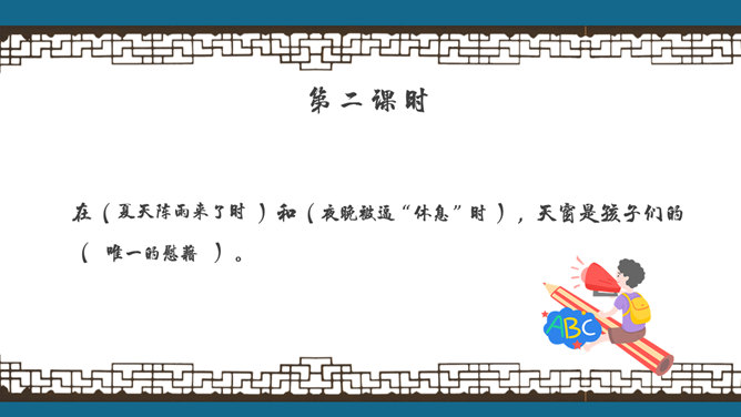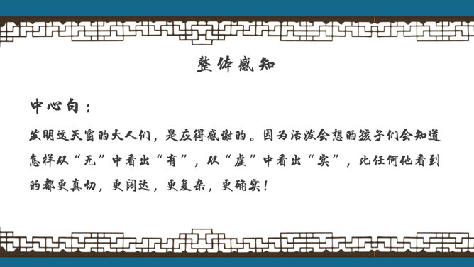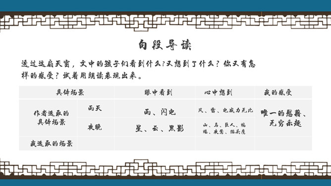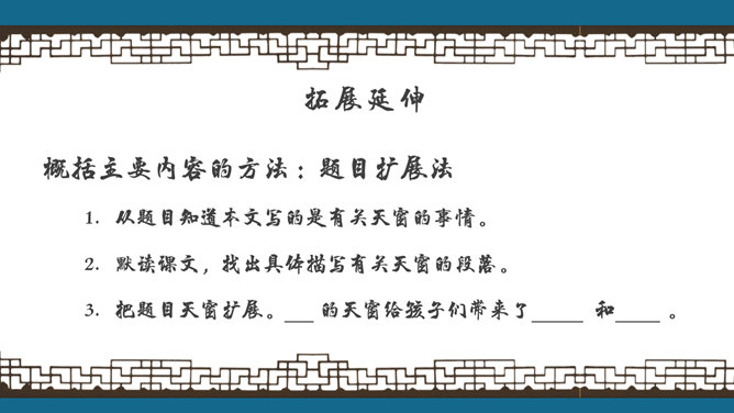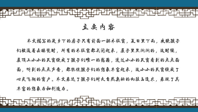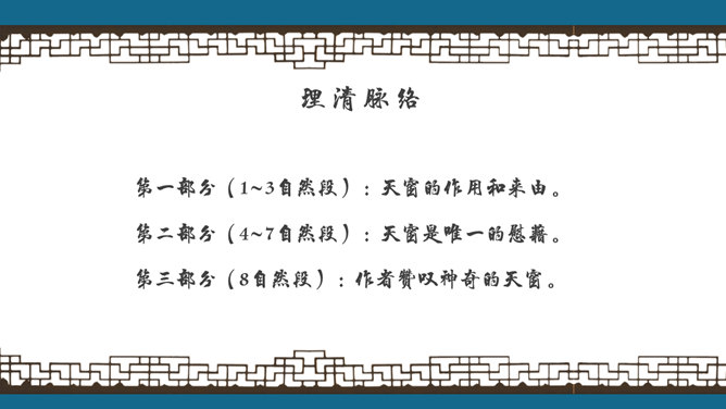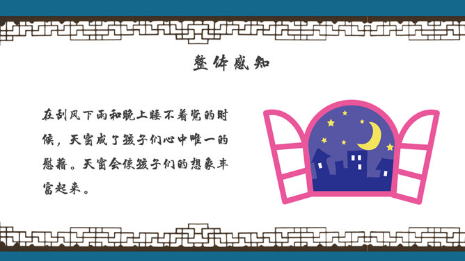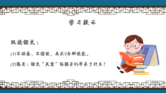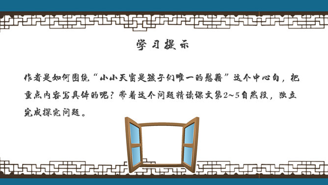 听范读正音,并熟悉本课的近反义词。个性化读书——顶天立地读。(注意不认识的字多读两遍,读通句子)小组合作读书(选择喜欢的方式)默读课文:不动唇,不指读,要求2分钟读完。思考:课文“天窗”给孩子们带来了什么?小组讨论:说一说本文写了什么。你是用什么方法概况课文内容的?作者是如何围绕“小小天窗是孩子们唯一的慰藉”这个中心句,把重点内容写具体的呢?带着这个问题精读课文第2~5自然段,独立完成探究问题。所属专题:天窗ppt。