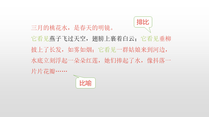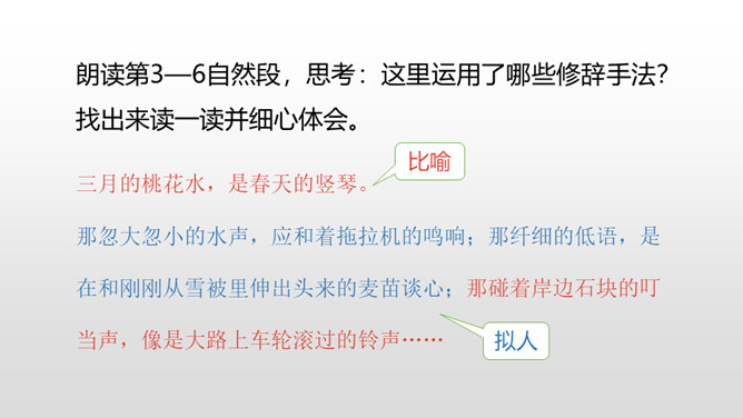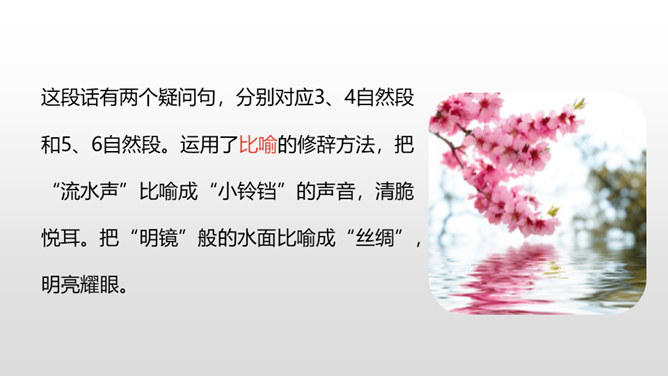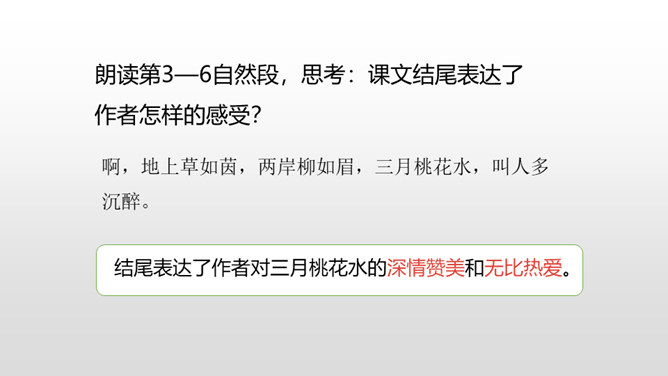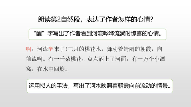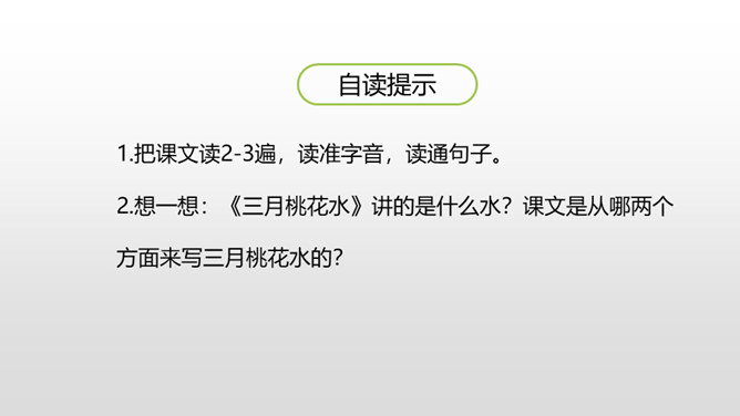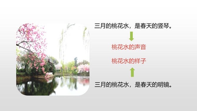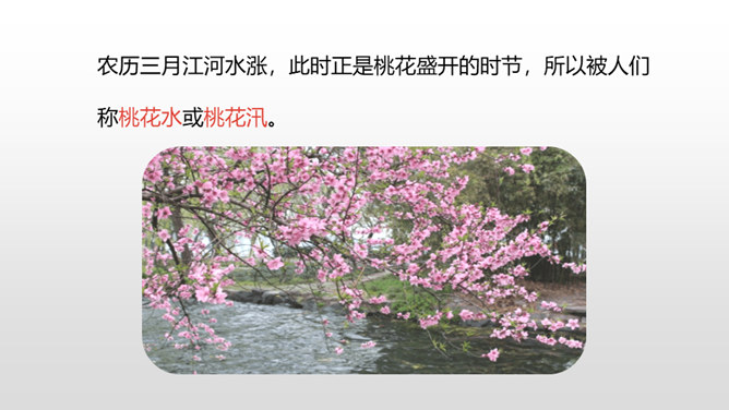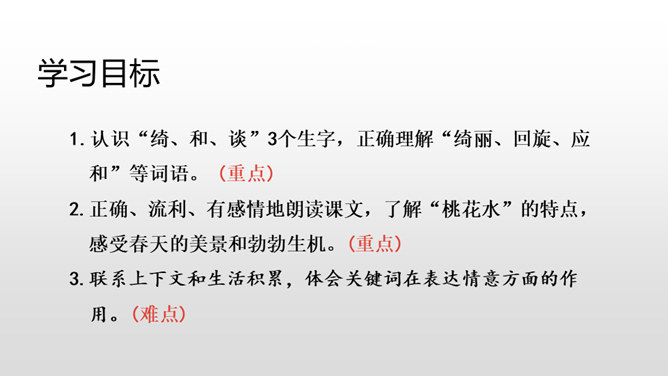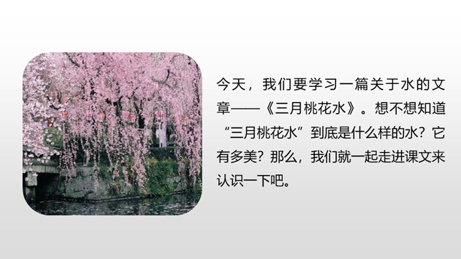 1.认识“绮、和、谈”3个生字,正确理解“绮丽、回旋、应和”等词语。 (重点)2.正确、流利、有感情地朗读课文,了解“桃花水”的特点,感受春天的美景和勃勃生机。(重点)3.联系上下文和生活积累,体会关键词在表达情意方面的作用。(难点)今天,我们要学习一篇关于水的文章——《三月桃花水》。想不想知道“三月桃花水”到底是什么样的水?它有多美?那么,我们就一起走进课文来认识一下吧。所属专题:三月桃花水ppt。