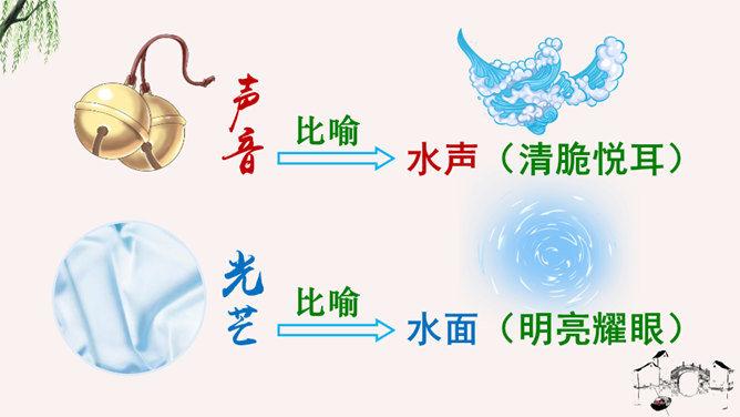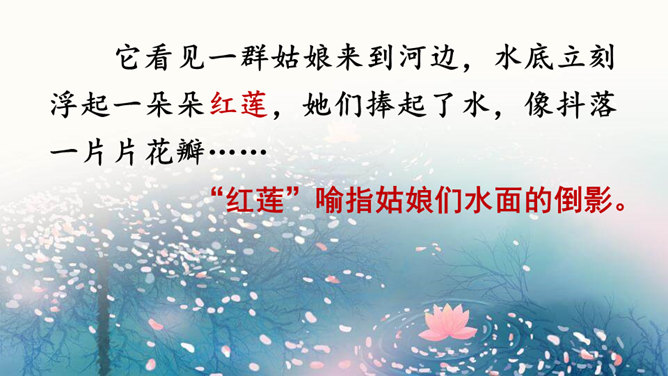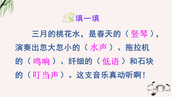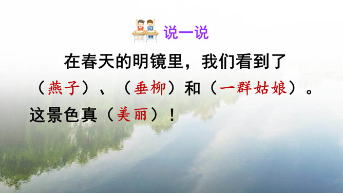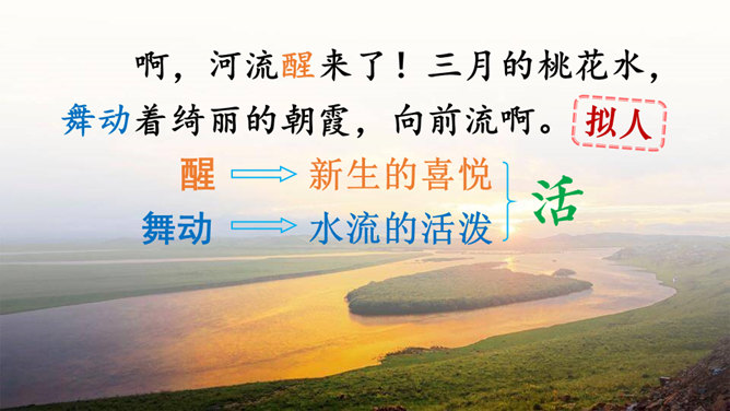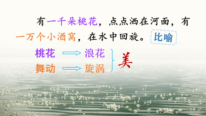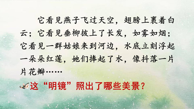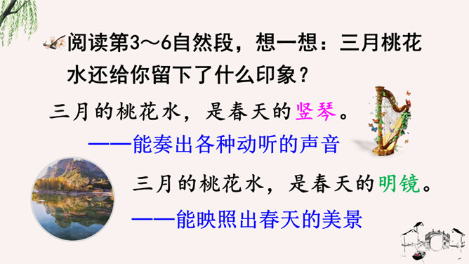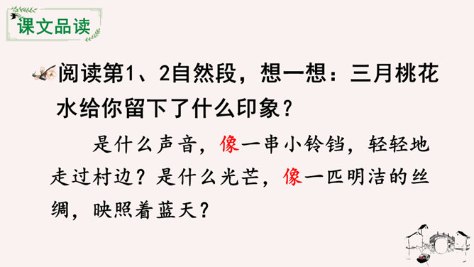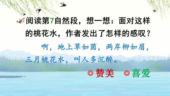阅读第1、2自然段,想一想:三月桃花水给你留下了什么印象?这“明镜”照出了哪些美景?阅读第7自然段,想一想:面对这样的桃花水,作者发出了怎样的感叹?三月的桃花水真美啊!除了文中写到的美景,你还能看到些什么呢?发挥想象,说一说。反复朗读课文中的优美句段,模仿句段,写一写四季之一的自然景观,或写一写春天游园的见闻。提示:可以运用比喻、拟人、排比等修辞手法,按照一定的顺序,写清楚这处景观的特点或春天游园的所见所想,要写出自己的独特感受。所属专题:三月桃花水ppt。